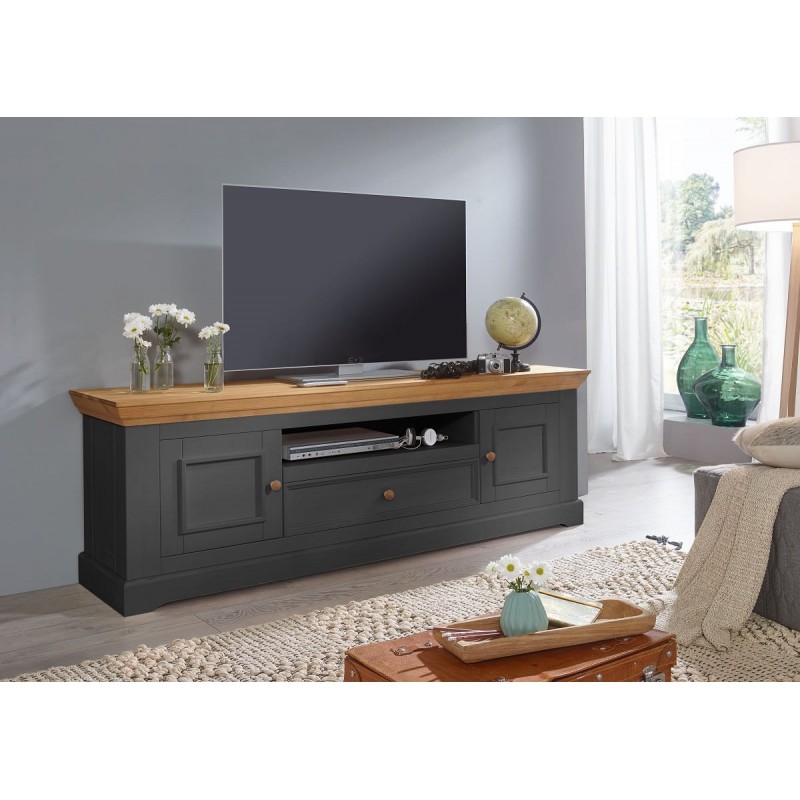 Тумба Форест ТВ 2 двери 1 ящик серый 7012/бейц-масло белорусской коллекции из соснового массива - по центру узкая ниша с ящиком, симметрично расположенные по бокам дверцы с глухими филенками, пространство за ними разделено внутренней полкой.