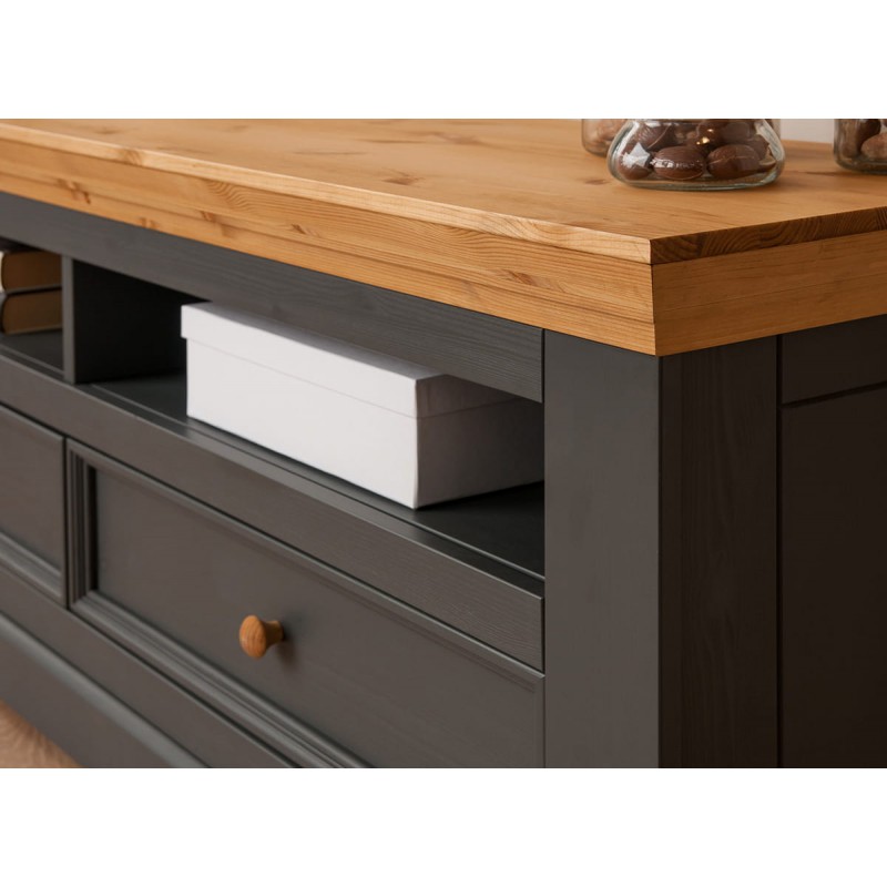 Тумба ТВ Форест 2 ящика серый 7012/бейц-масло белорусской коллекции предназначена для того, чтобы разместить большой телевизор и другую технику. Плавное и бесшумное передвижение ящиков обеспечивают роликовые механизмы. Покрытие тумбы воском белый / антрацит придает модели торжественный вид.