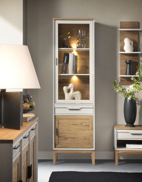 Шкаф имеет основание с высокими крепкими ножками, которые обеспечивают ему устойчивость. Кроме того, шкаф не нужно сдвигать во время уборки: под ним остается достаточно пространства, в том числе для уборки роботом-пылесосом. За остекленной дверцей расположены полки, на которых можно хранить посуду или сувениры. На дверцах и ящике чёрные профильные ручки.