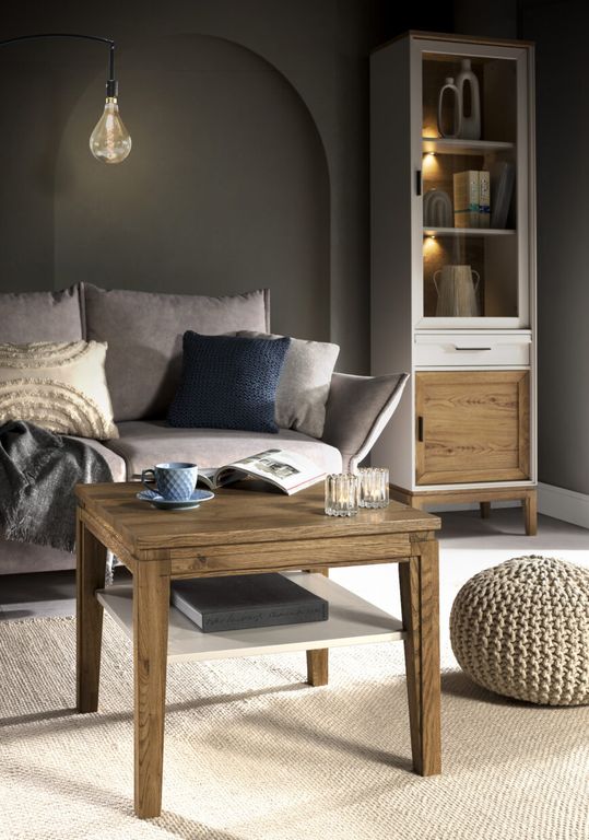 Крышка, нижняя дверца и основание окрашены в цвет «антик», остальные части изделия в белом цвете. Через покрытие цвета антик видна природная текстура сосны.  Он будет естественно смотреться не только на кухне, но и в гостиной. При этом он совместим с предметами в разных стилях: скандинавском, классическом, винтажном, кантри.
