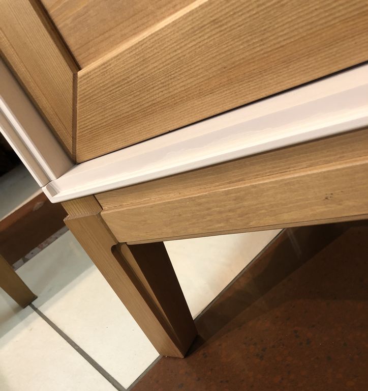 Крышка, нижняя дверца и основание окрашены в цвет «антик», остальные части изделия в белом цвете. Через покрытие цвета антик видна природная текстура сосны. Он будет естественно смотреться не только на кухне, но и в гостиной. При этом он совместим с предметами в разных стилях: скандинавском, классическом, винтажном, кантри.