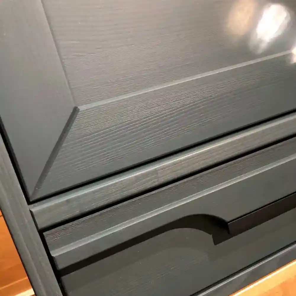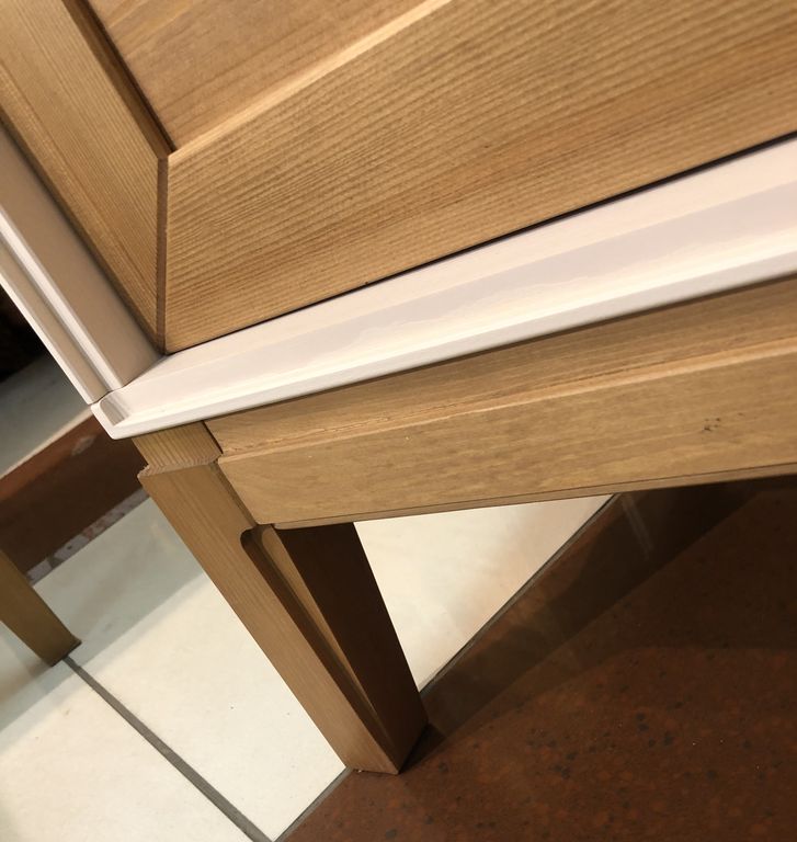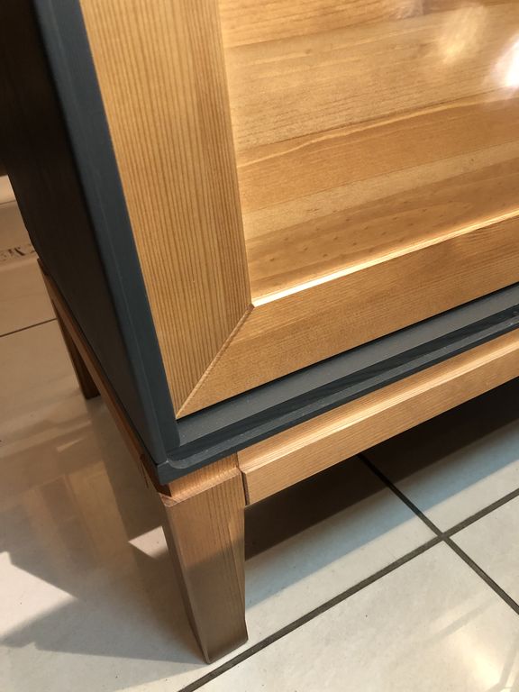 Задняя стенка и донья ящиков сделаны из ДВП. Столешница, дверцы и основание окрашены в цвет «антик», остальные части изделия – в цвете «серый 7016». Через покрытие цвета антик видна природная текстура сосны.