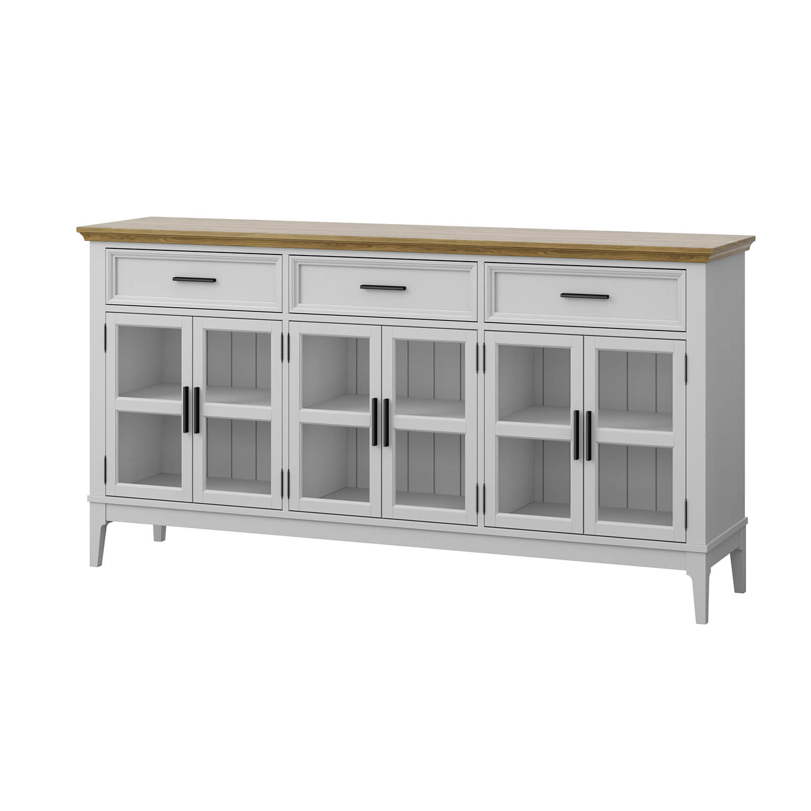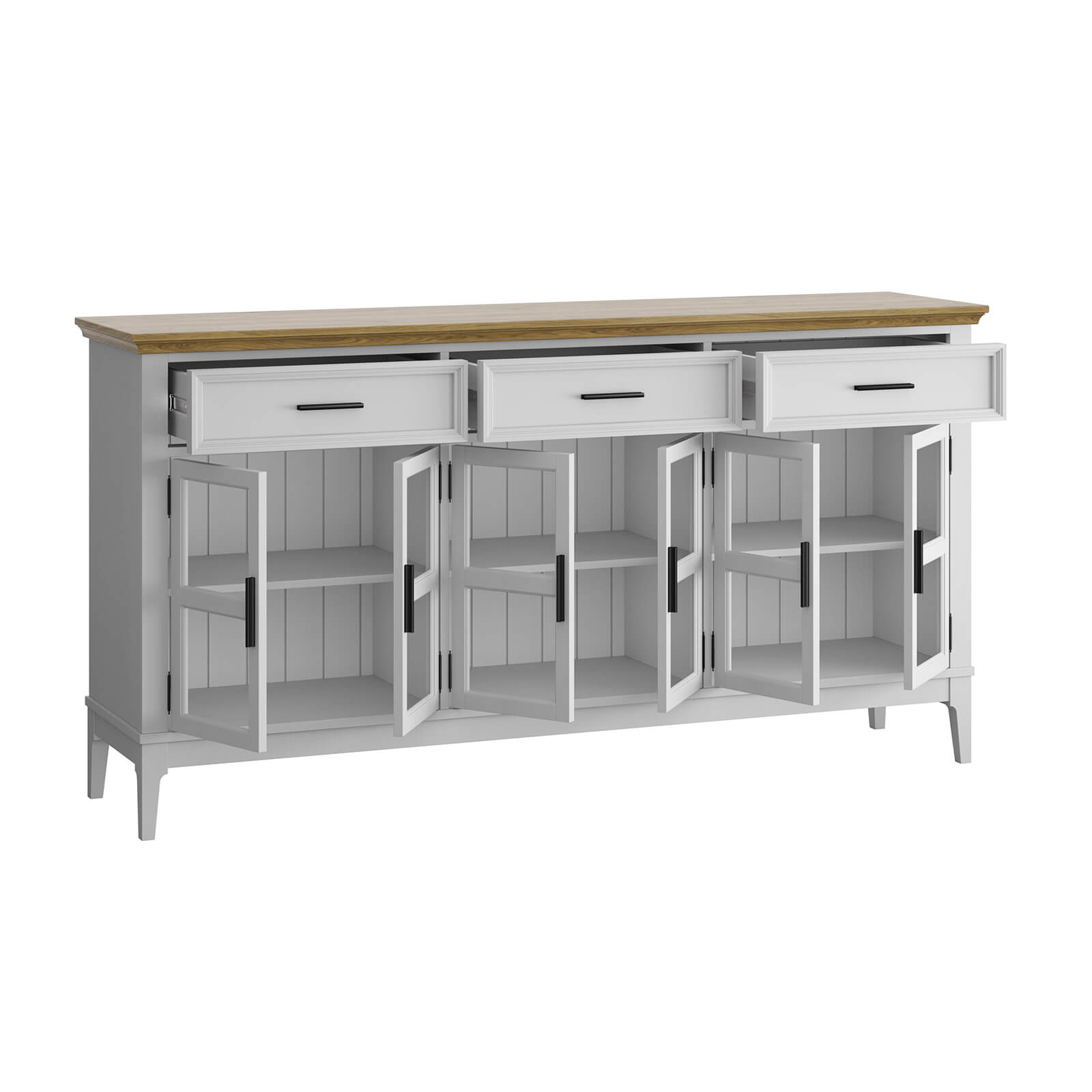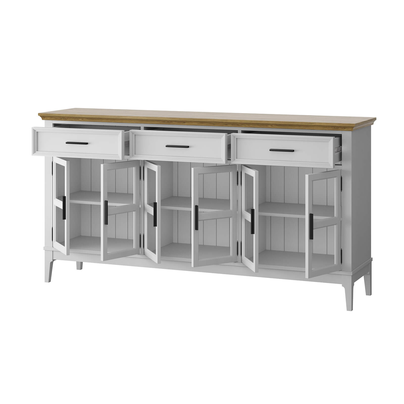 Шесть распашных стеклянных дверей и три ящика на телескопических шариковых направляющих.