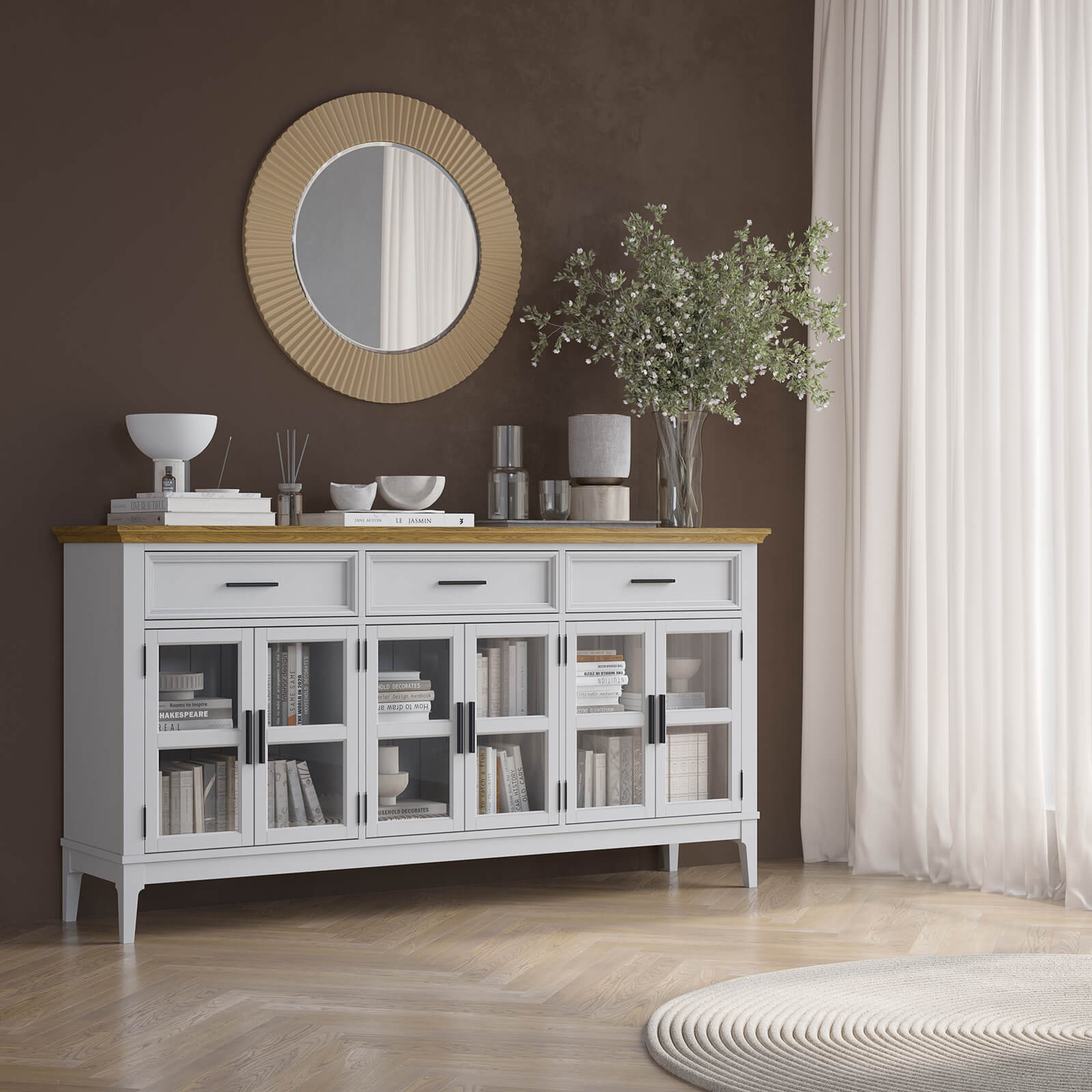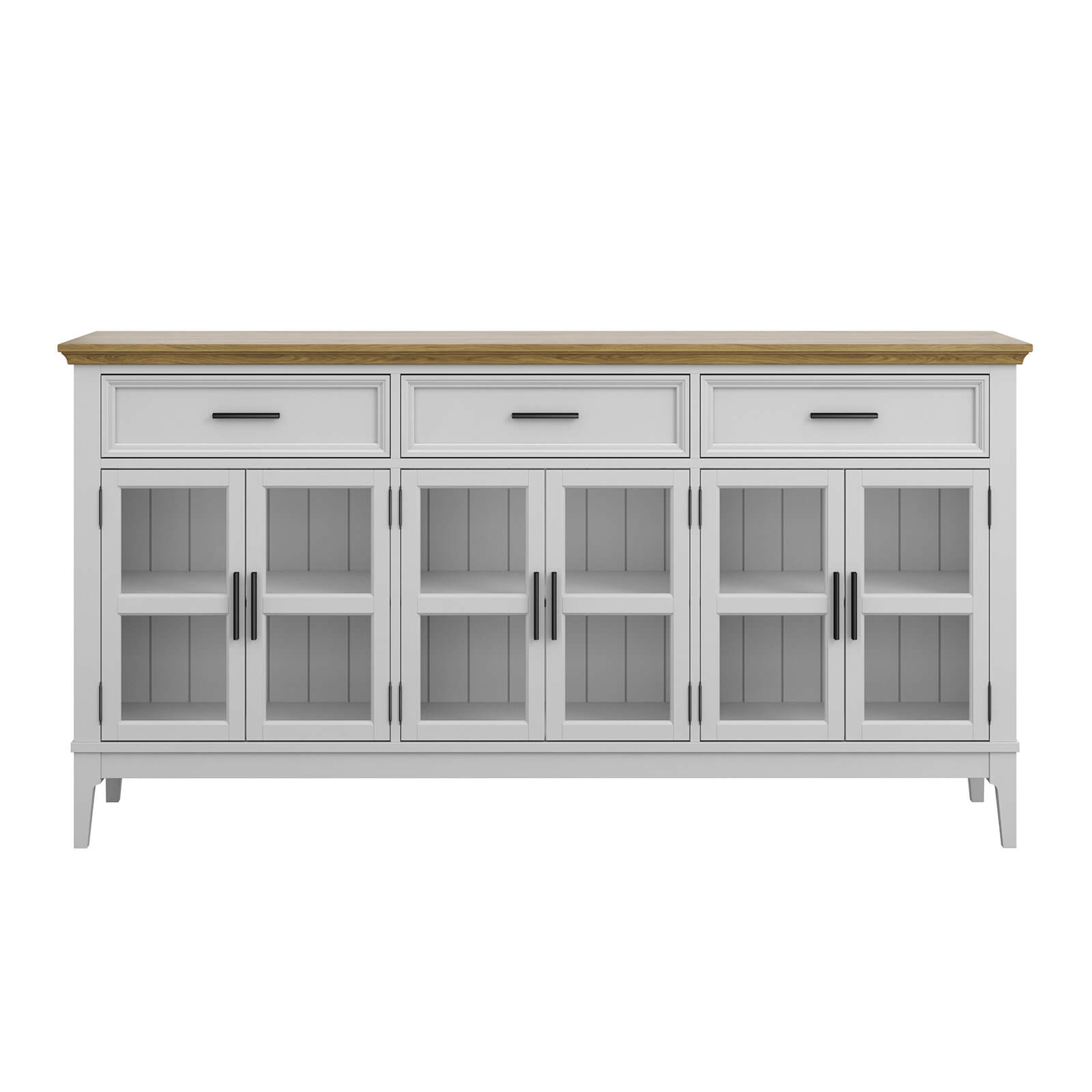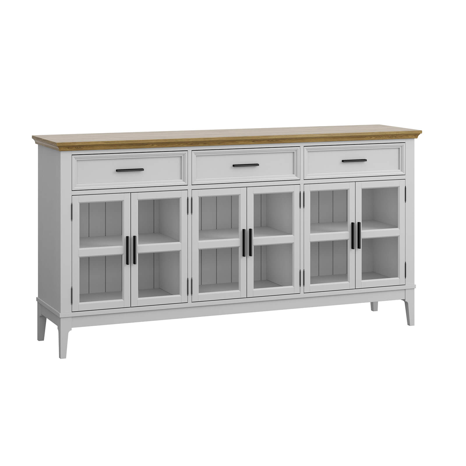 Шесть распашных стеклянных дверей и три ящика на телескопических шариковых направляющих.