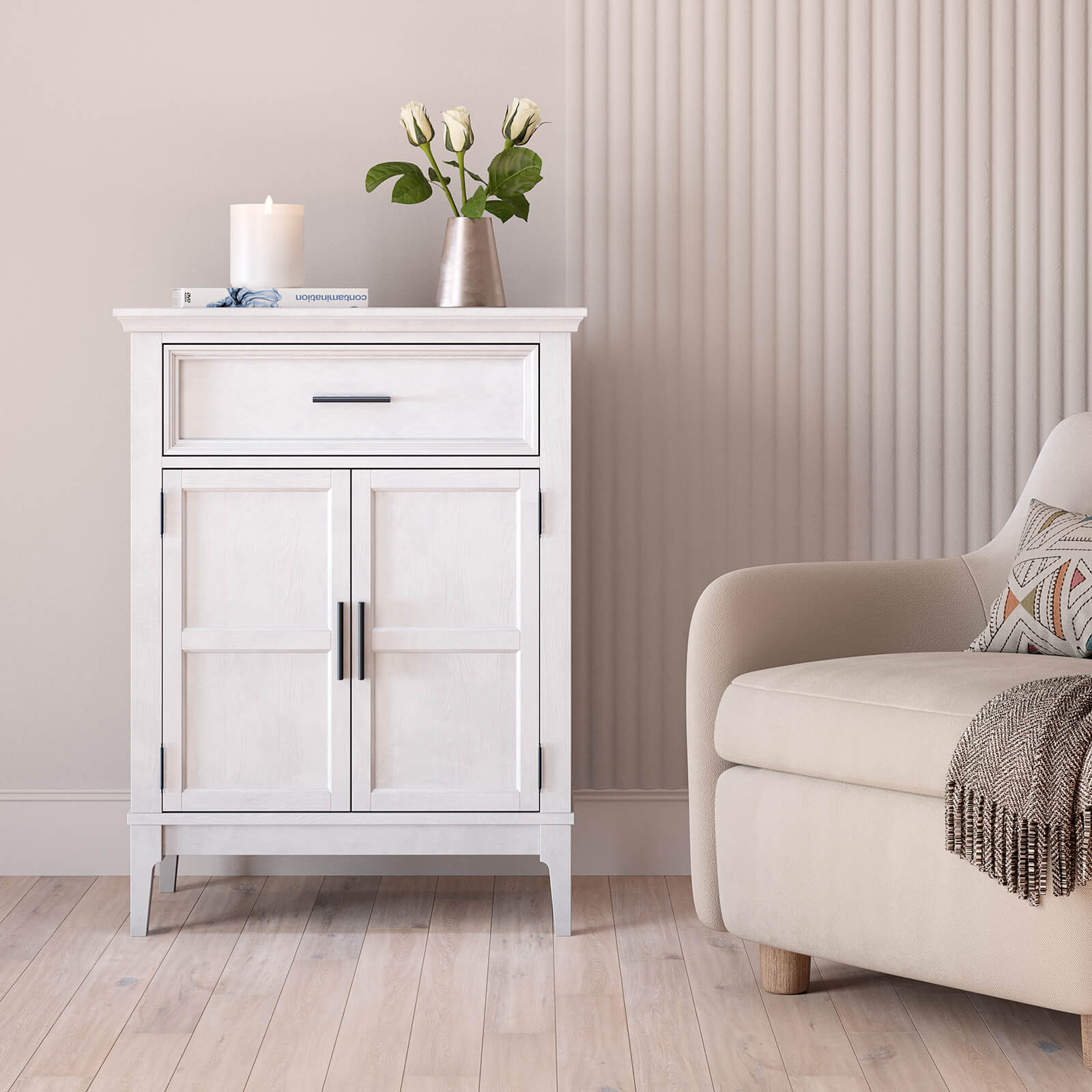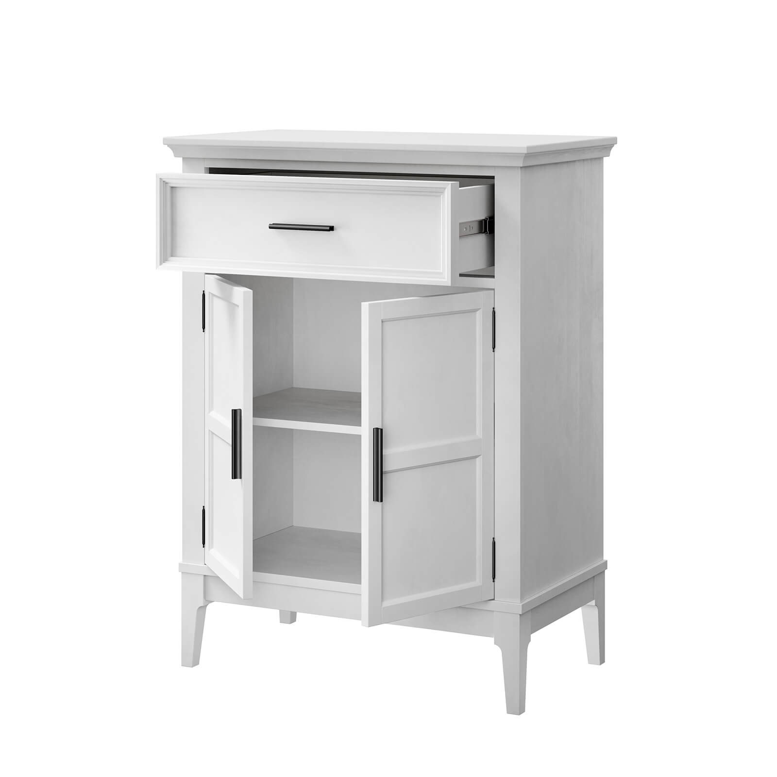 Тумба Квадро-С 21 массив сосны, покрытие - белый лак. Две распашные двери и один ящик на телескопических шариковых направляющих.