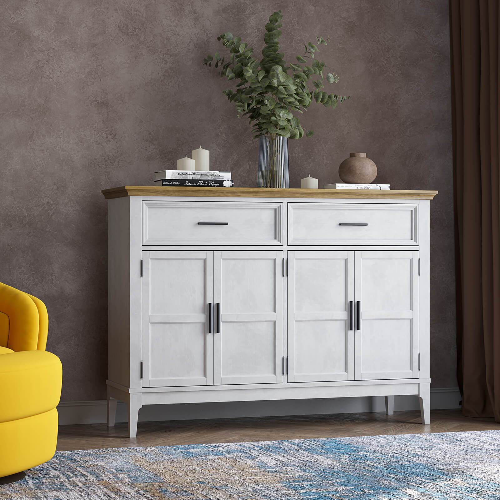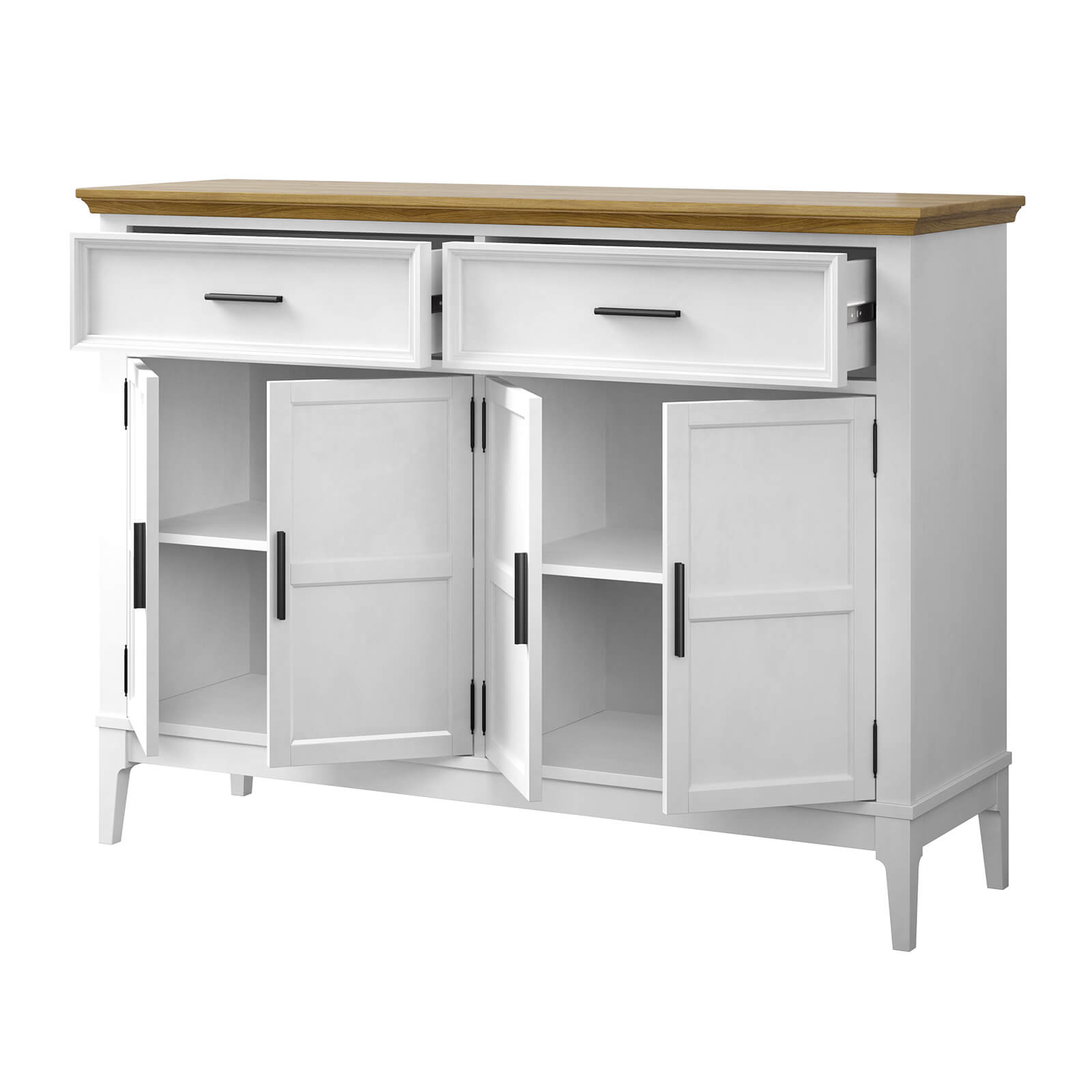 Тумба Квадро-С 42 массив сосны, покрытие - белый лак - антик 24. Четыре распашные двери и два ящика на телескопических шариковых направляющих.