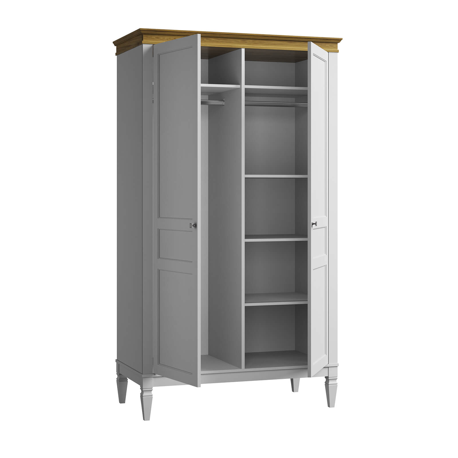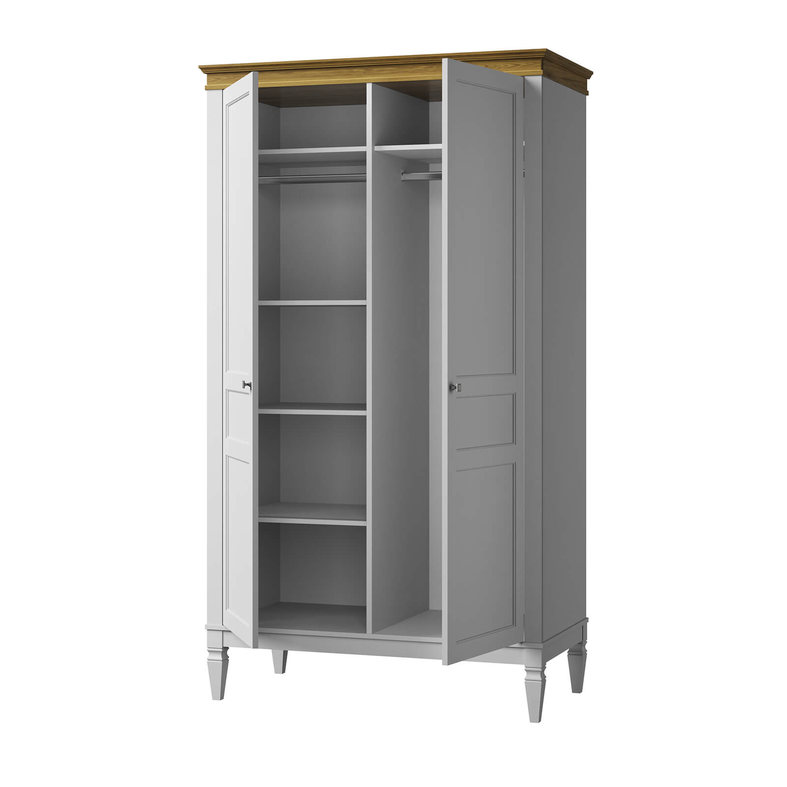 Распашной, комбинированный - отделение  с полками и отделение платяное с штангой для вешалок.