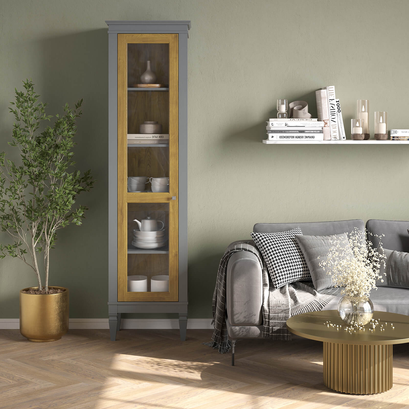 Шкаф для посуды Ольса-С 100 Л серый №7042 + антик №24 для гостиной.
