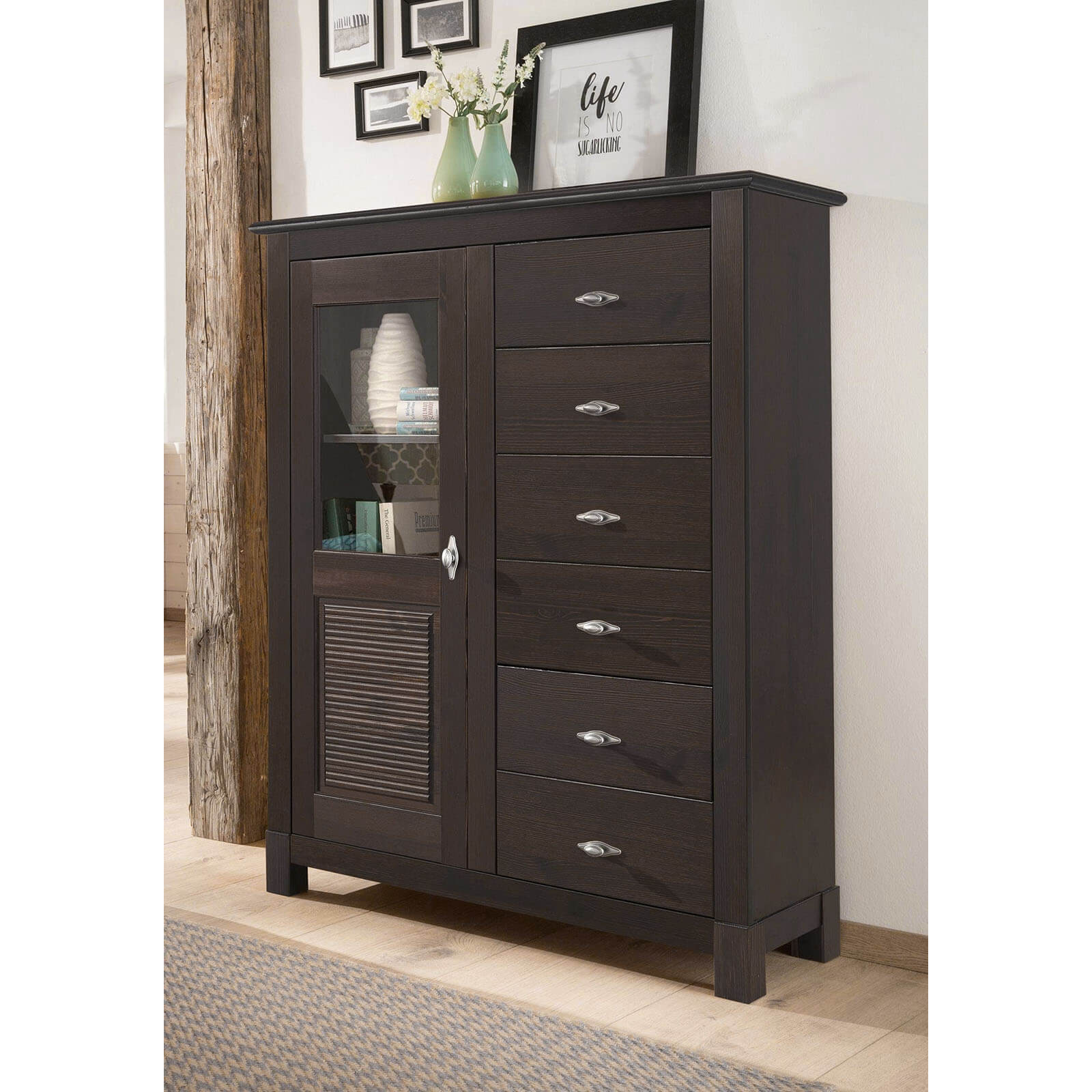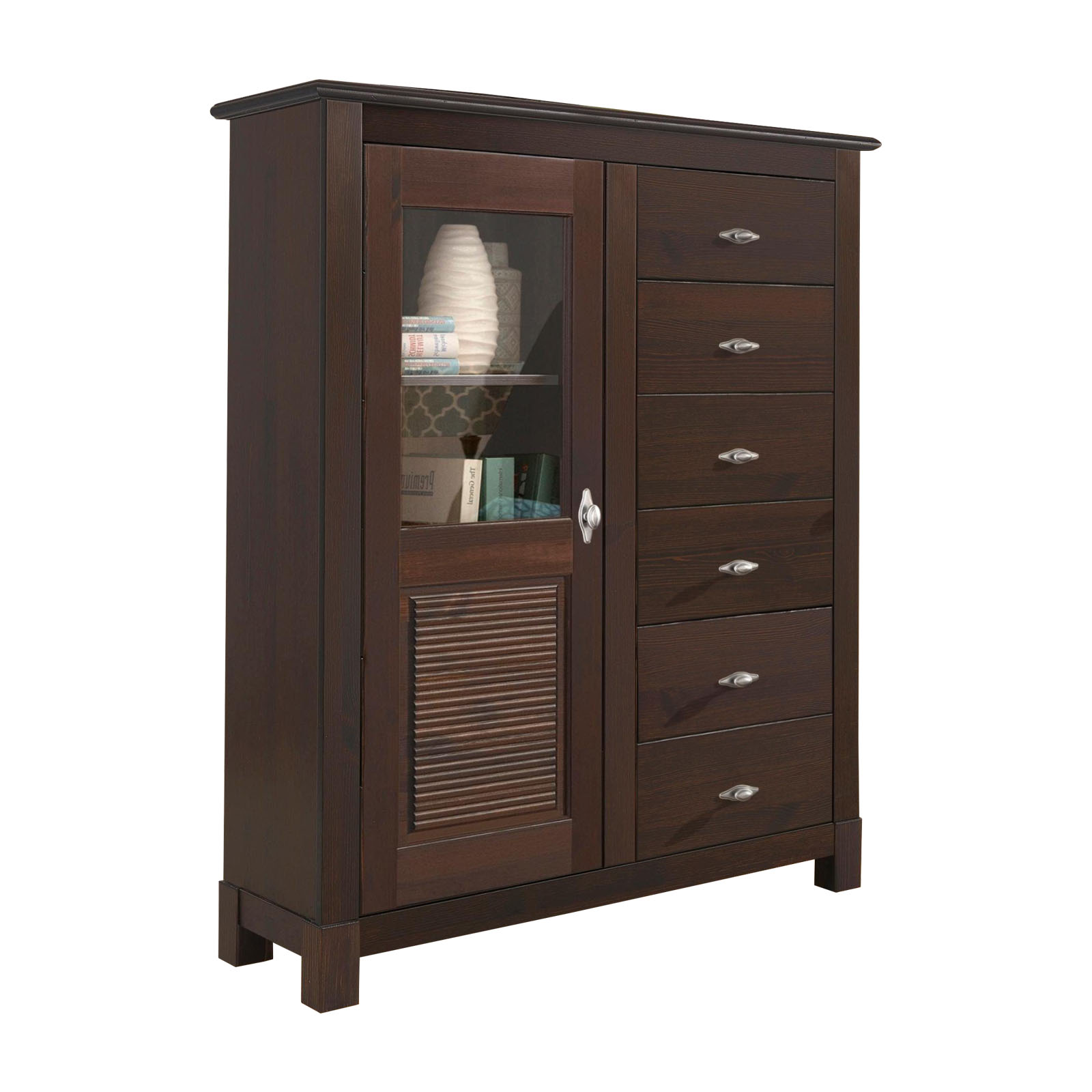 Комод Рауна-16 из сосны в отделке (колониал). Внушительная вместимость комода позволяет поставить его в гостиную - одна дверь и шесть ящиков - массив сосны.