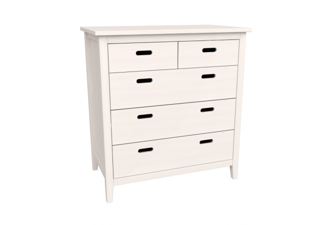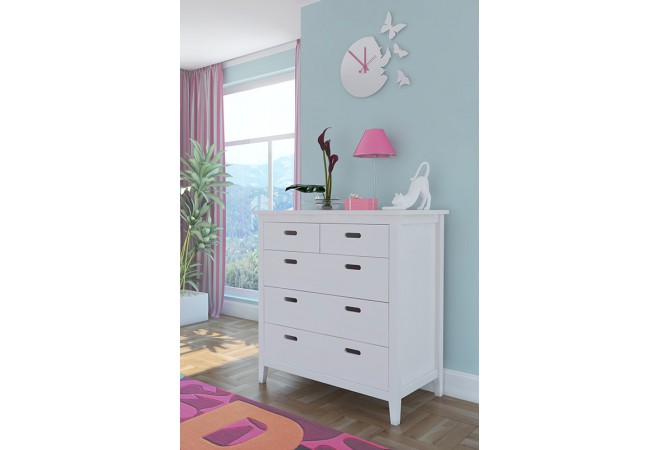 Небольшой, однако вмещающий в себя достаточное количество вещей комод для детской комнаты Сиело. Три широких ящика и два узких над ними двигаются на роликовых направляющих. Комод окрашен белым воском, ручки в виде прорезей на лицевых панелях подчеркивают безопасность эксплуатации.