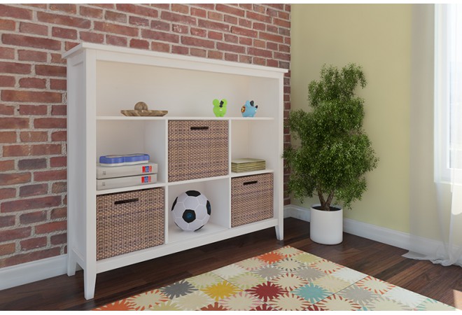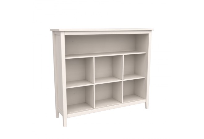 Стеллаж среднего размера из сосны - белый воск - из серии мебели Сиело для детской. Деревянные перегородки делят стеллаж на 6 равных по объёму ниш.