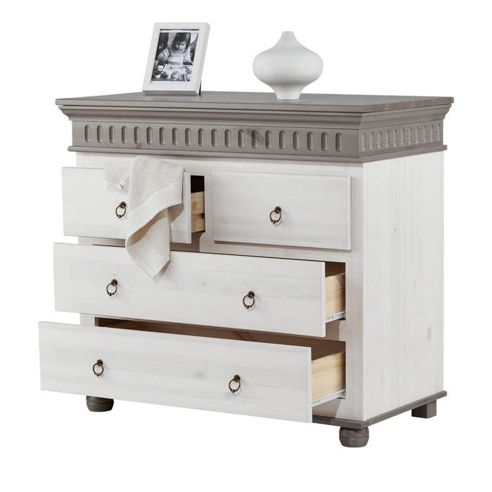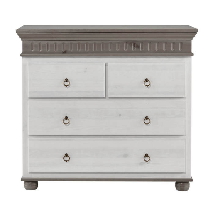 Комод Хельсинки -22 Белый воск+серый из массива сосны в отделке белым воском.