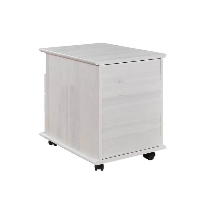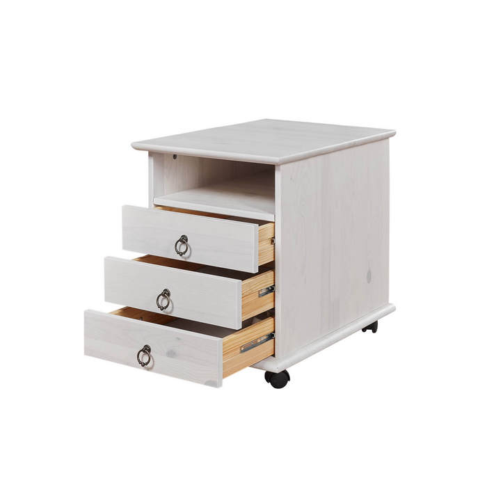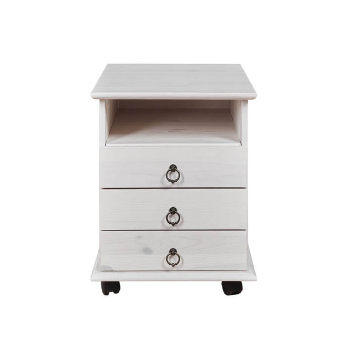 Тумба три ящика и открытой нищей для хранения личных вещей. В комплекте деревянные ножки и передвижные мебельные роликовые опоры.