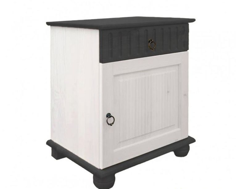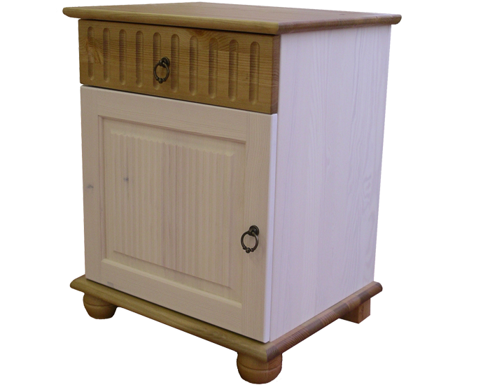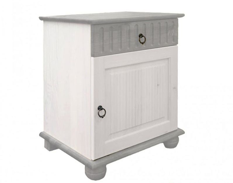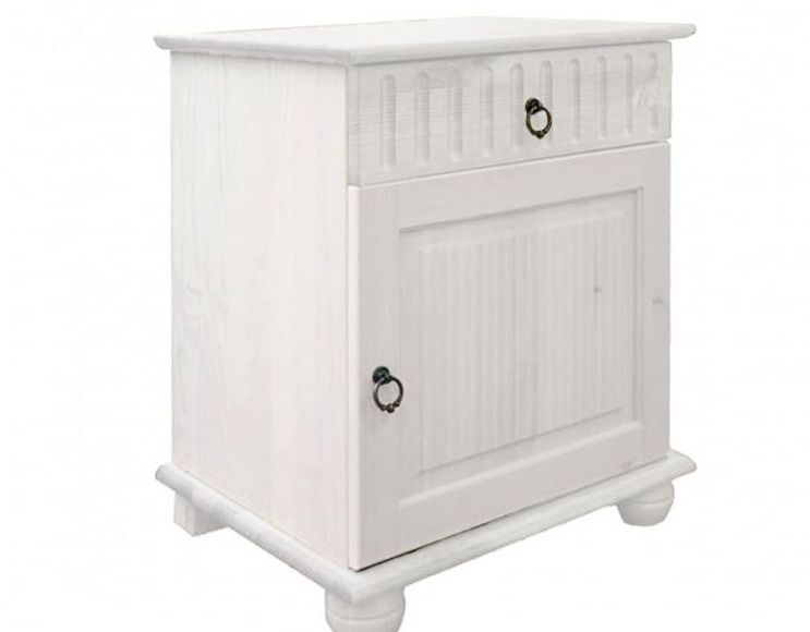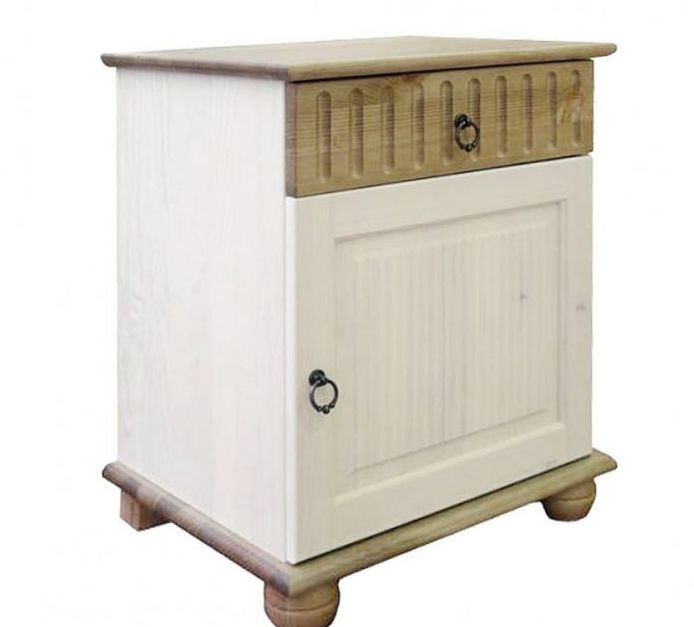 Прикроватная тумба серии Хельсинки из массива сосны с одним ящиком и дверью покрыта белым воском.