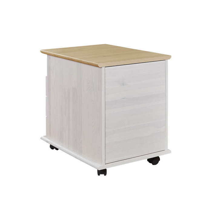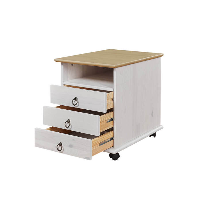 Компактная подкатная тумба с тремя вместительными выдвижными ящиками и открытой полкой для хранения личных вещей. В комплекте деревянные ножки и передвижные мебельные роликовые опоры.