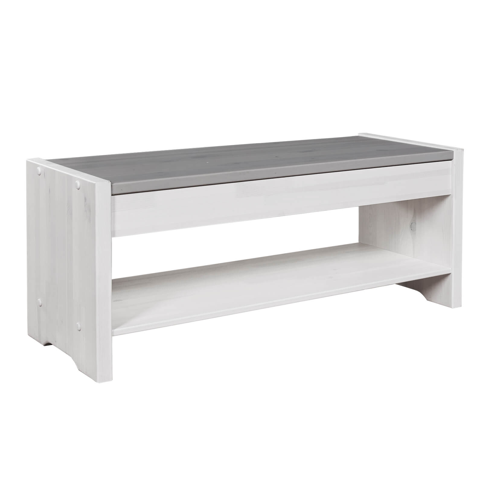 Удобная и прочная Скамья Бостон(Стокгольм)-115 с 2-я ящиками белый воск+серый , на которую можно не только не опасаясь присесть. но и что-то положить в ящики и разместить на внутренней полке.