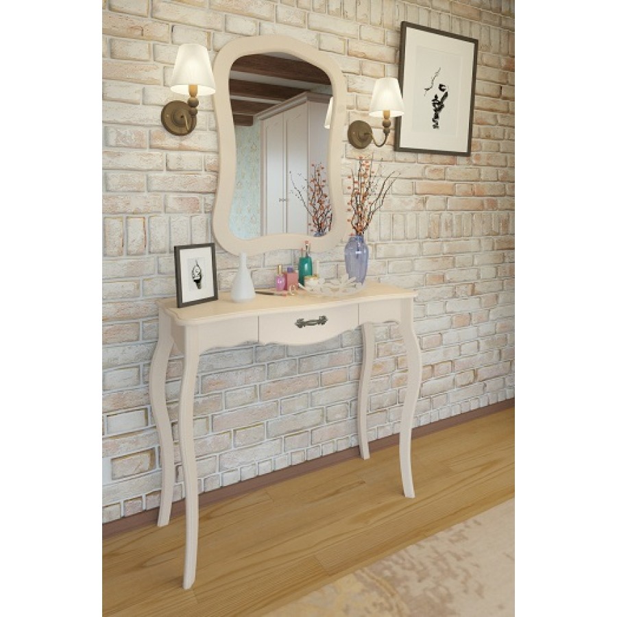Консоль Лебо - приставной к стене туалетный стол консольного типа в спальню или гостиную с  одним выдвижным ящиком. Достаточно широкая столешница консоли позволяет с легкостью разместить необходимые предметы для каждодневного ухода. Дополнит композицию настенное зеркало из этой коллекции.