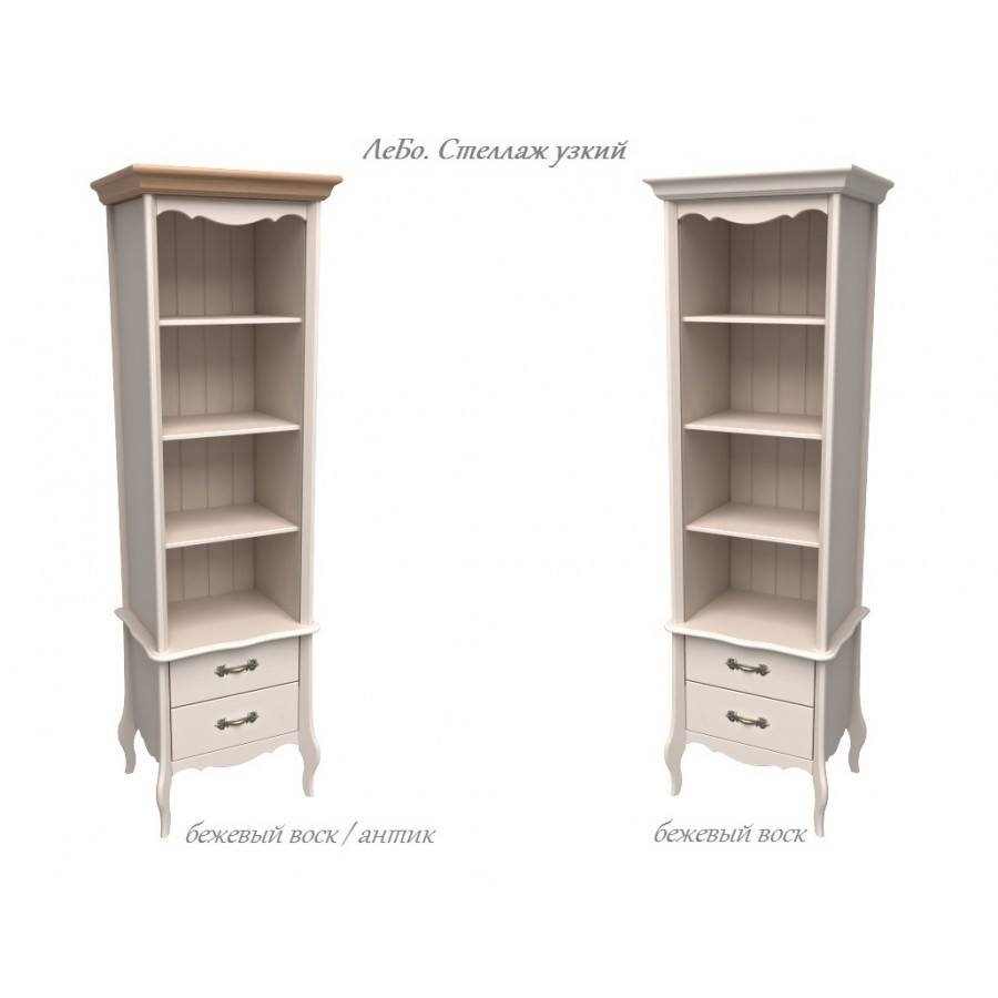 Небольшой по ширине стеллаж узкий Лебо артикул 55718 бежевый воск с двумя ящиками на направляющих и полками, регулируемыми по высоте. Наборная из отдельных деревянных панелей задняя стенка стеллажа повторяет рисунок коллекции.