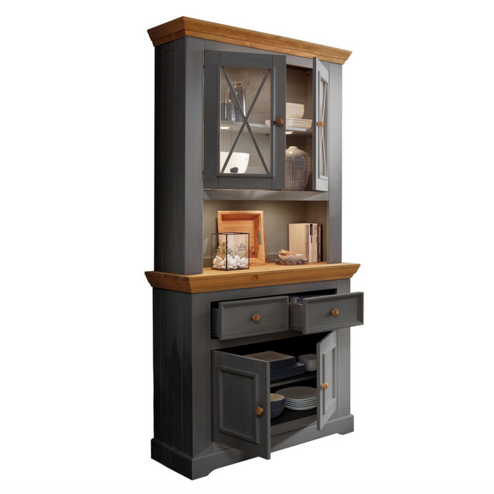 Буфет Форест малый серый 7012/бейц-масло из соснового массива в белом цвете. Включает в себя двухдверный нижний комод, который есть возможность приобрести отдельно и верхней надстройки буфета с двумя витринного типа дверцами.. Немецкая фурнитура обеспечивает плавное движение ящиков и бесшумное движение фасадов.
