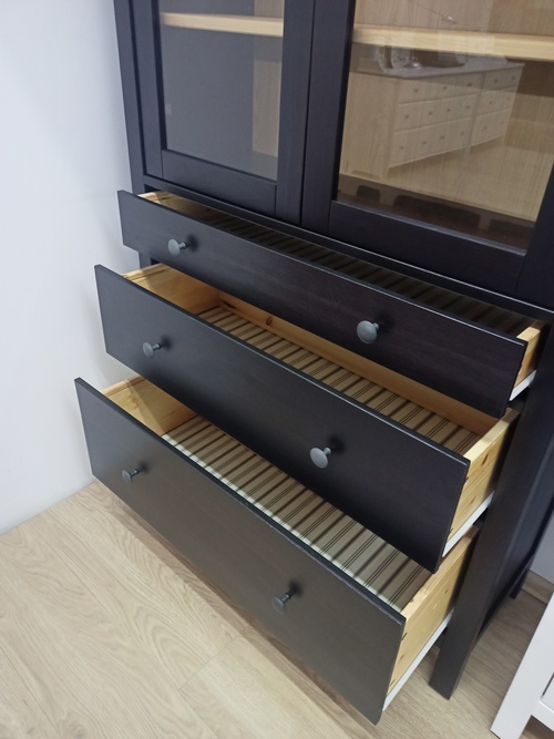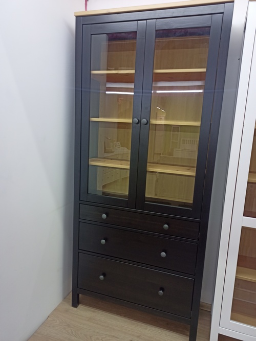 Деревянный Шкаф-витрина ХЕМНЭС 3 ящика оригинал, цвет венге / светло-коричневый, изготовлен из массива сосны, дно и задняя стенка ящиков выполнены из оргалита. Полки шкафа можно использовать для размещения книг, посуды и памятных сувениров. Стеклянные дверцы защитят содержимое от пыли и грязи.