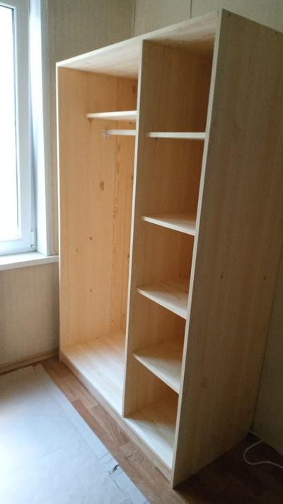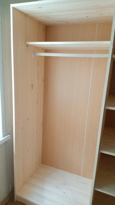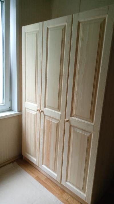 Шкаф Оскар-3 фасад без сучков. Массив сосны. Конструкция шкафа комбинированная - платяное отделение на две двери и отделение с полками на 1 дверь. Поставляется в разобранном виде - 3 коробки.
