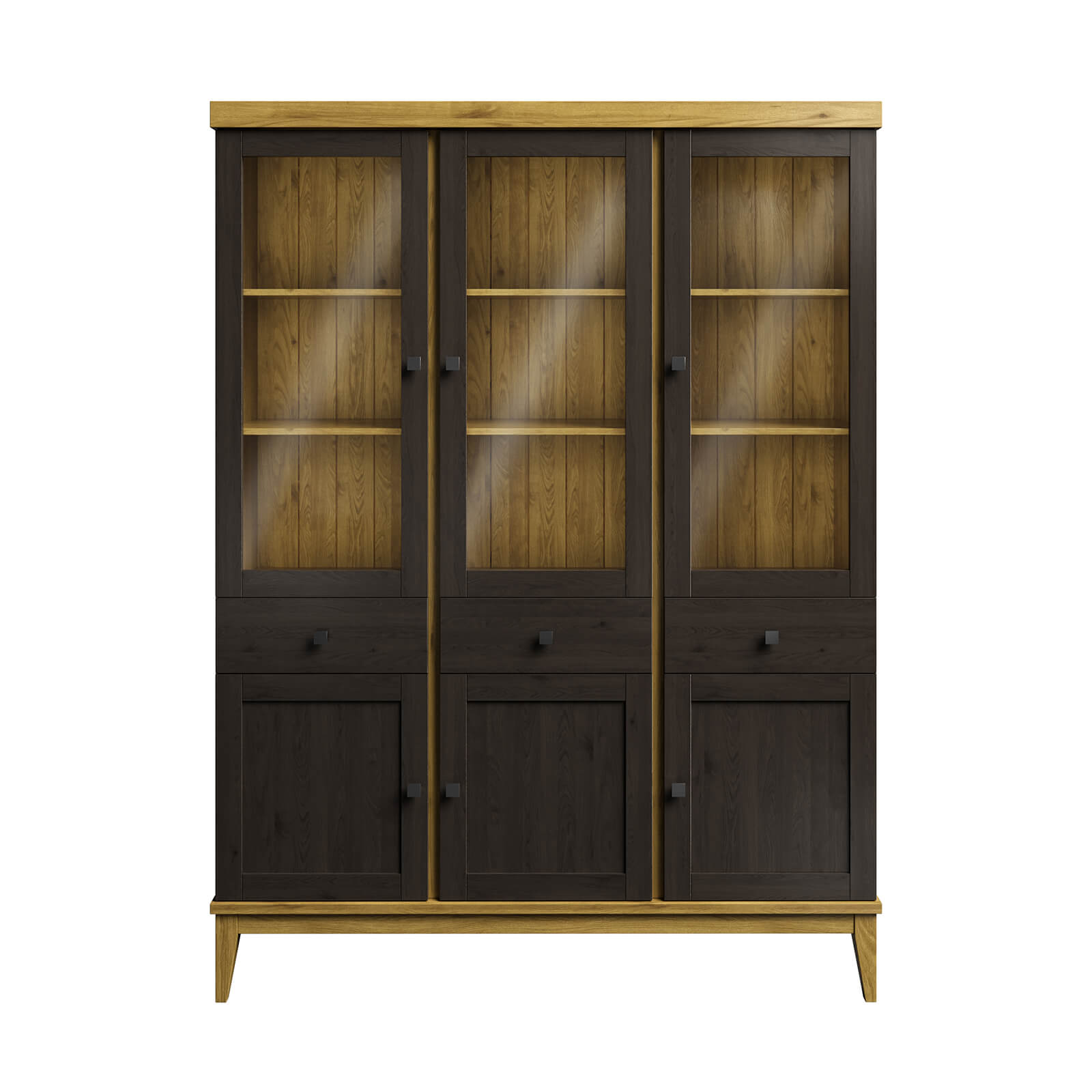 внизу три ящика, которые перемещаются на направляющих полного выдвижения и две глухие дверцы.
