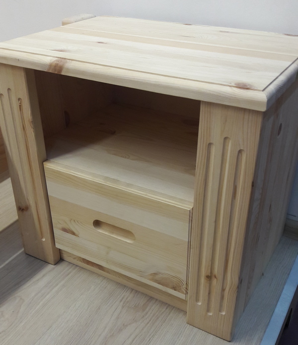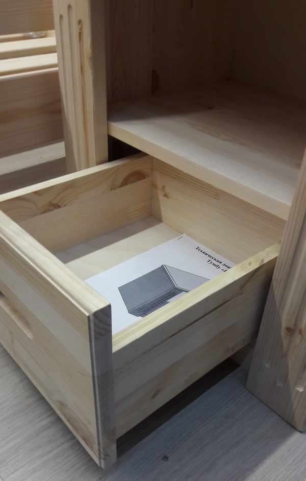 Тумба прикроватная Rino из массива сосны - открытая ниша и ящик под ней на направляющих полного выдвижения.