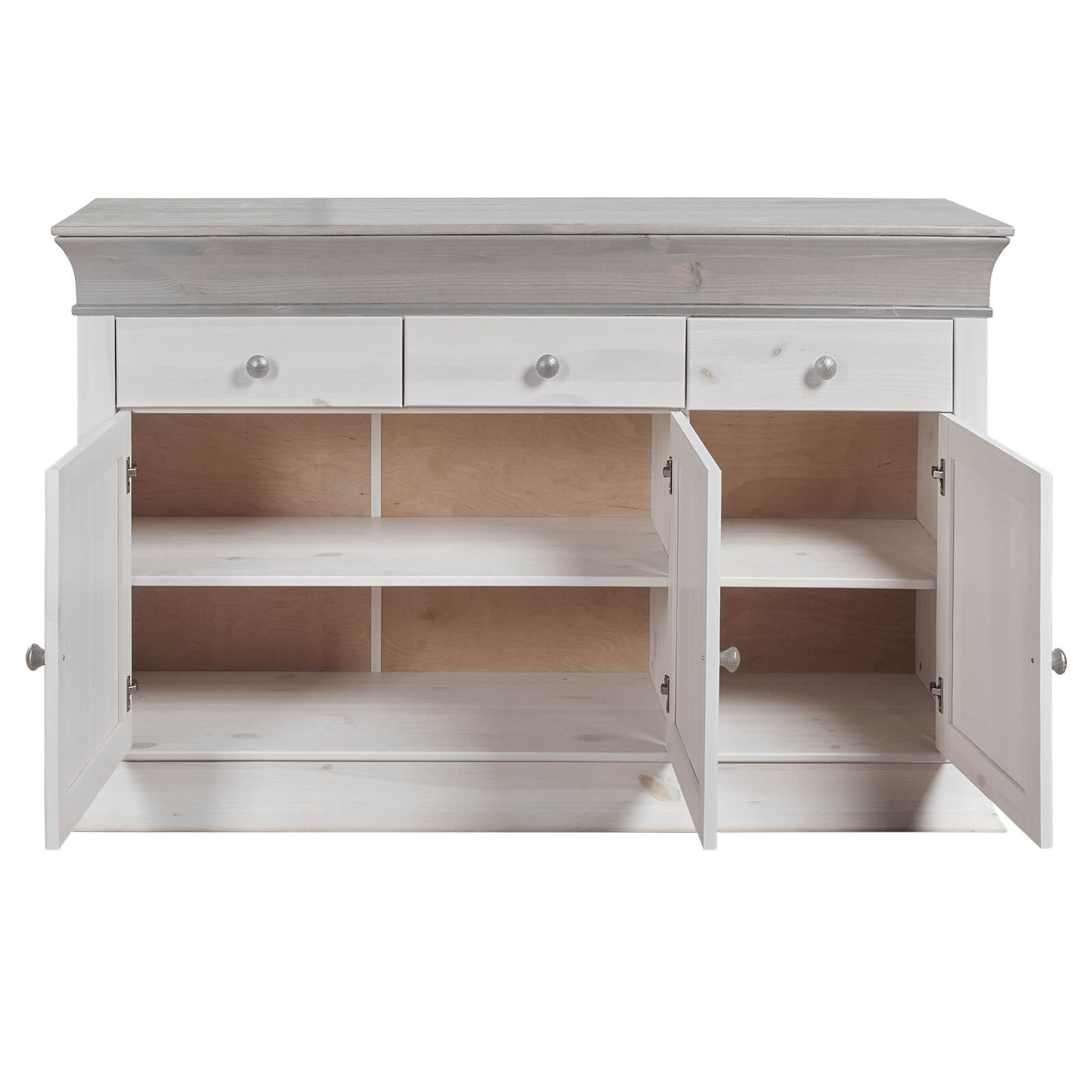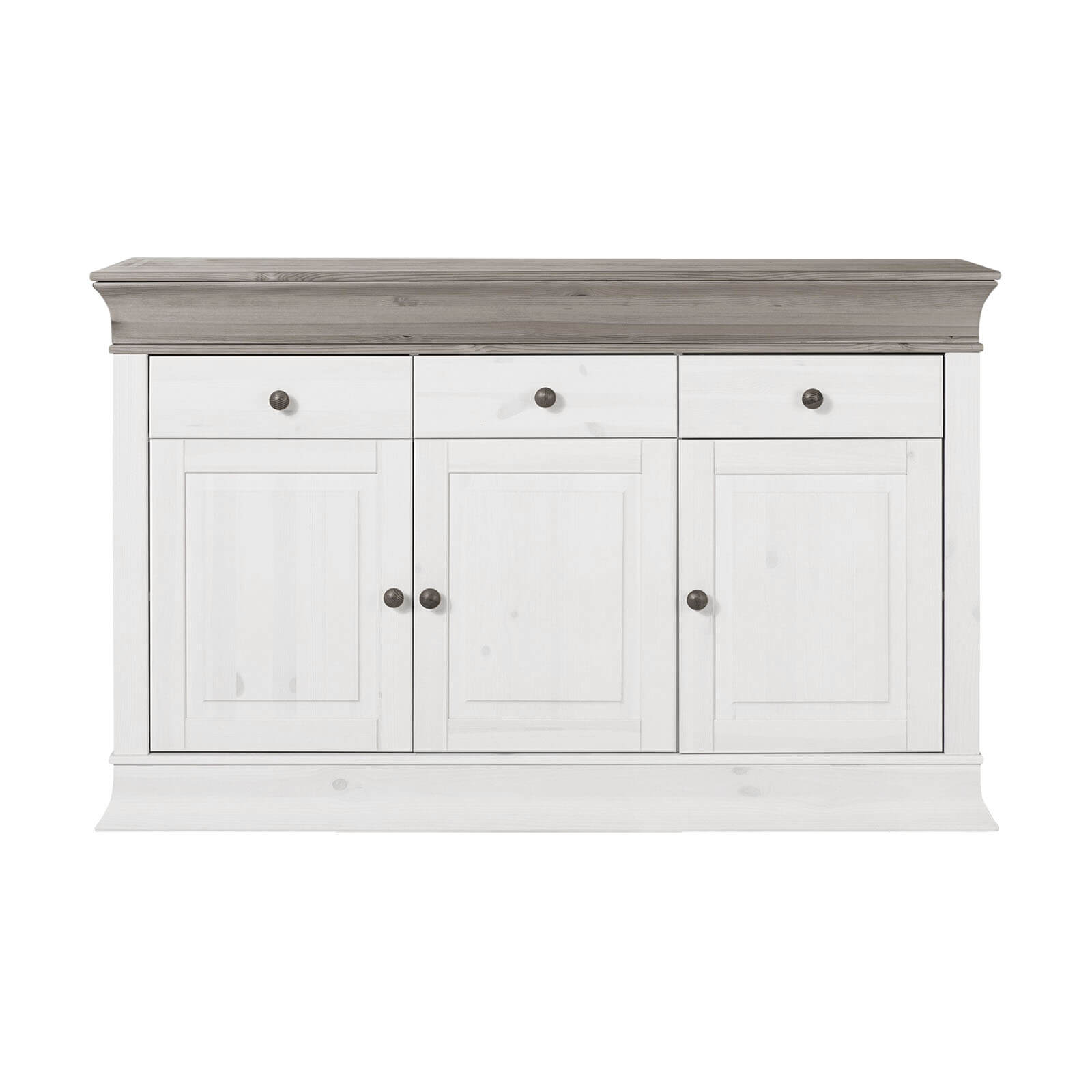 Вместительный Комод Бостон НББ (низ буфета Бостон) Белый воск+серый из массива сосны представляет собой весьма простую, проверенную временем, надёжную и удобную в использовании компактную мебель, подходящую для любой жилой комнаты при любом ремонте.
