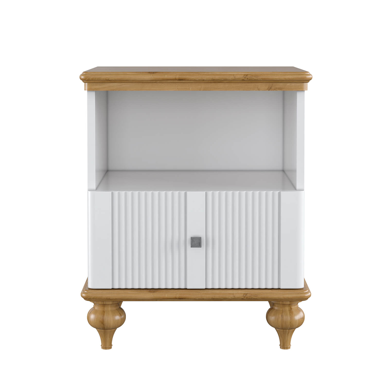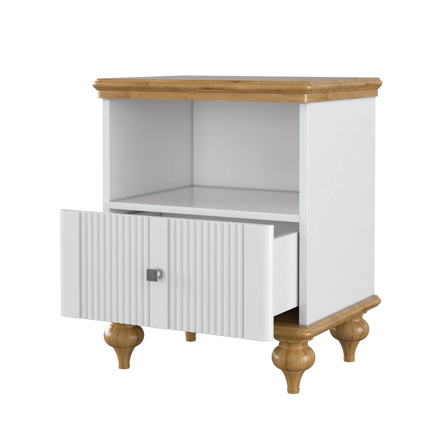 Прикроватная тумба Рандеву с открытой нишей и ящиком под ней (белый лак/антик-24). Массив сосны и МДФ. Покрытие корпуса - белый лак. Крышка и низ тумбы - воск антик.