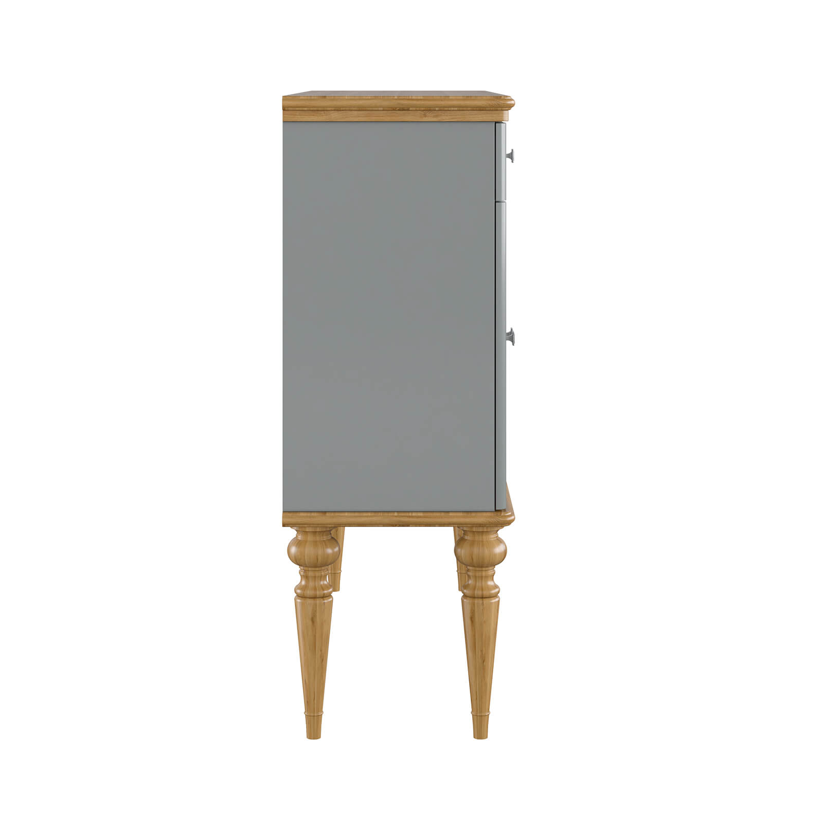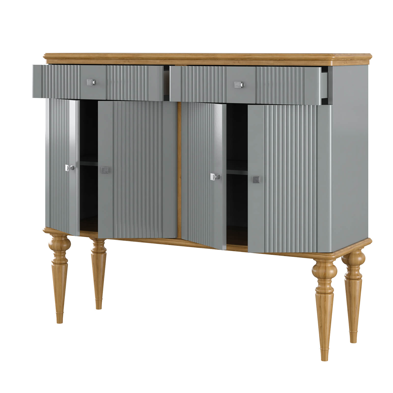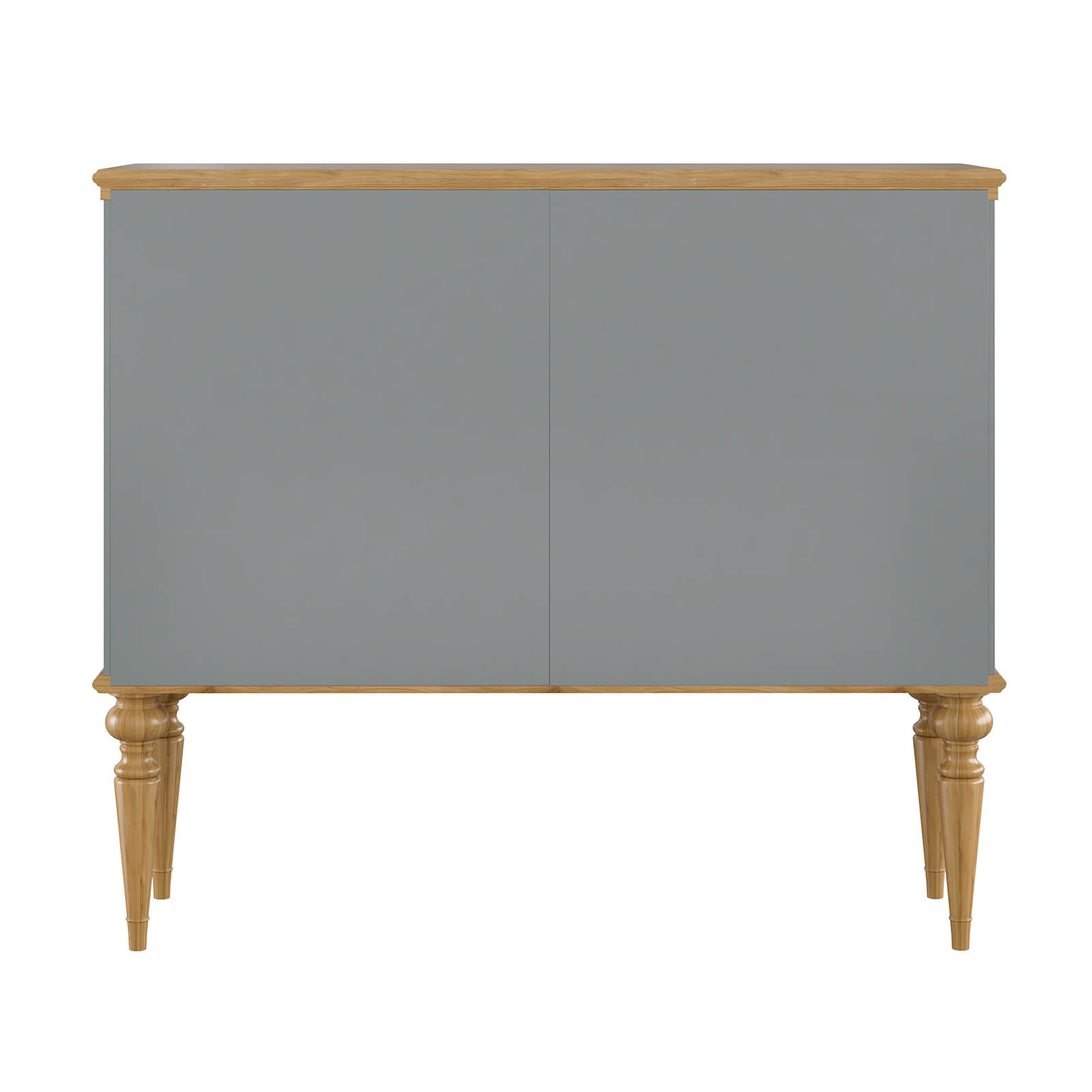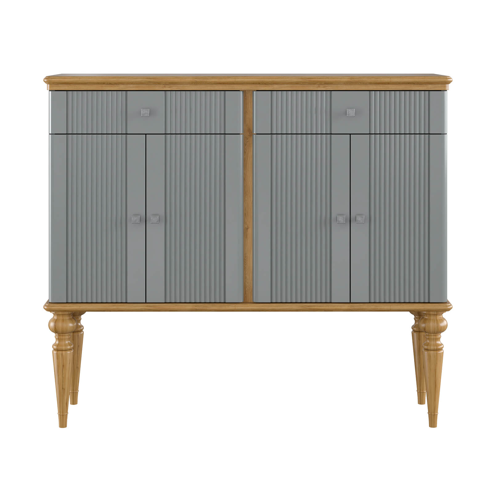 Тумба Рандеву-42 МАССИВ СОСНЫ серый № 7042 + антик №24 на высоких ножках четыре двери с 2-мя  ящичками. Покрытие корпуса - серый лак. Крышка  и низ тумбы - воск антик.