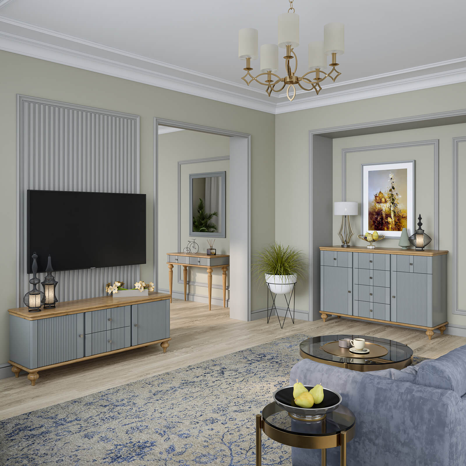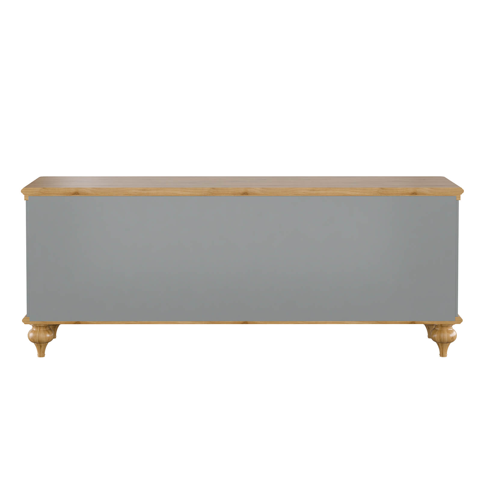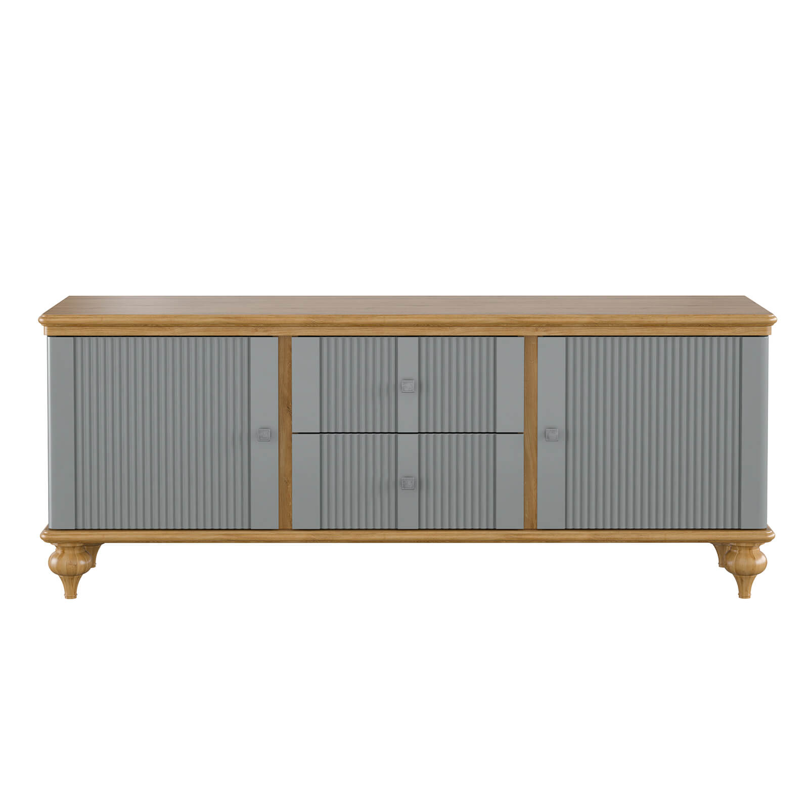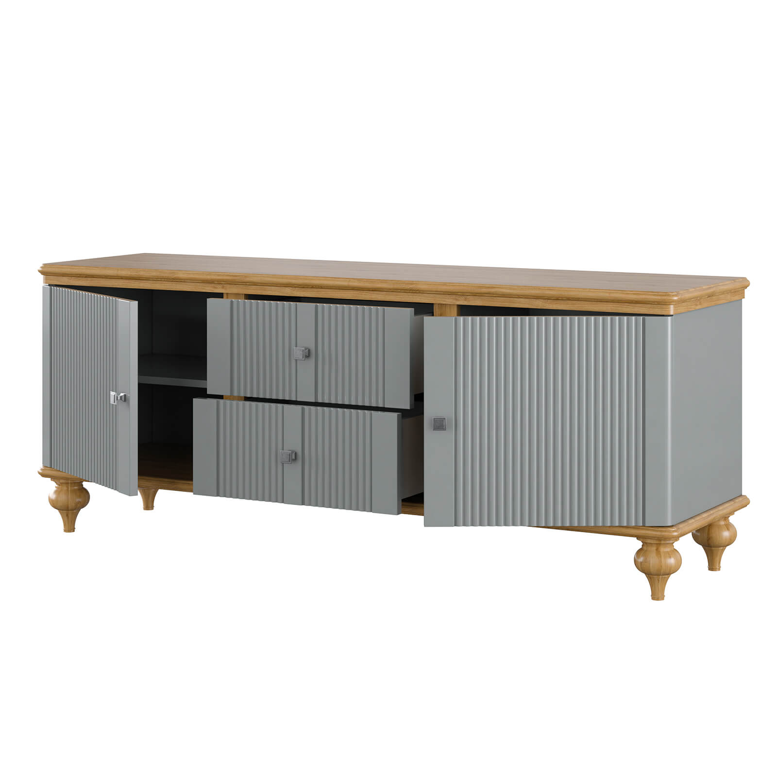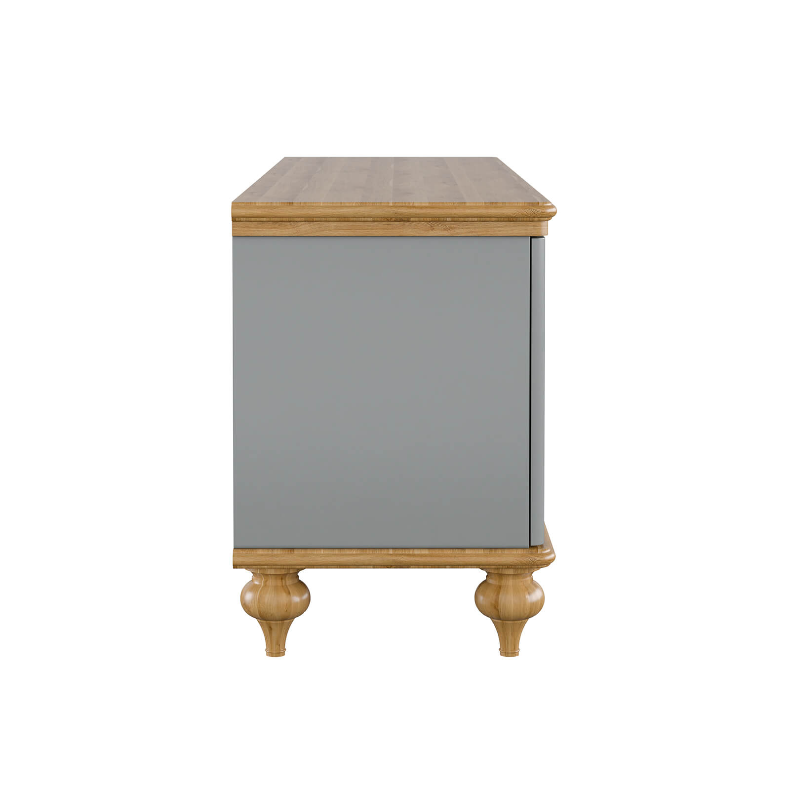 Тумба ТВ Рандеву-22 МАССИВ СОСНЫ серый №7042 + антик №24 - две двери и 2 ящика по центру, направляющие с доводчиками. Массив дерева. Покрытие корпуса - серый лак. Крышка и низ тумбы - воск антик.
