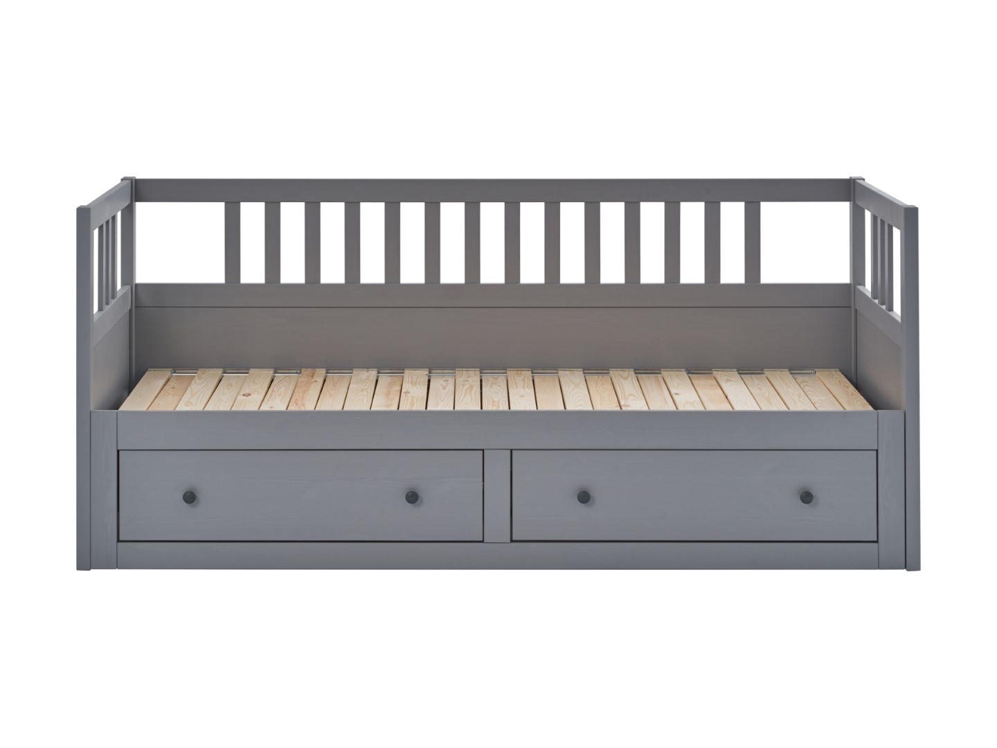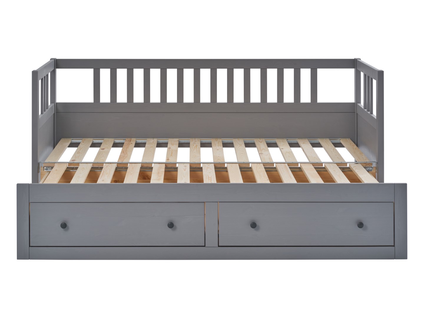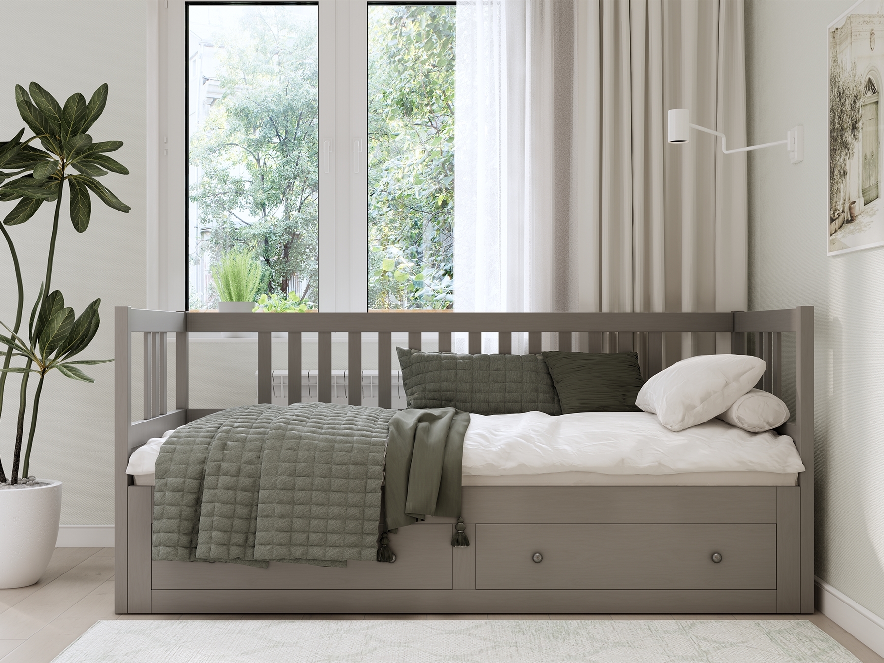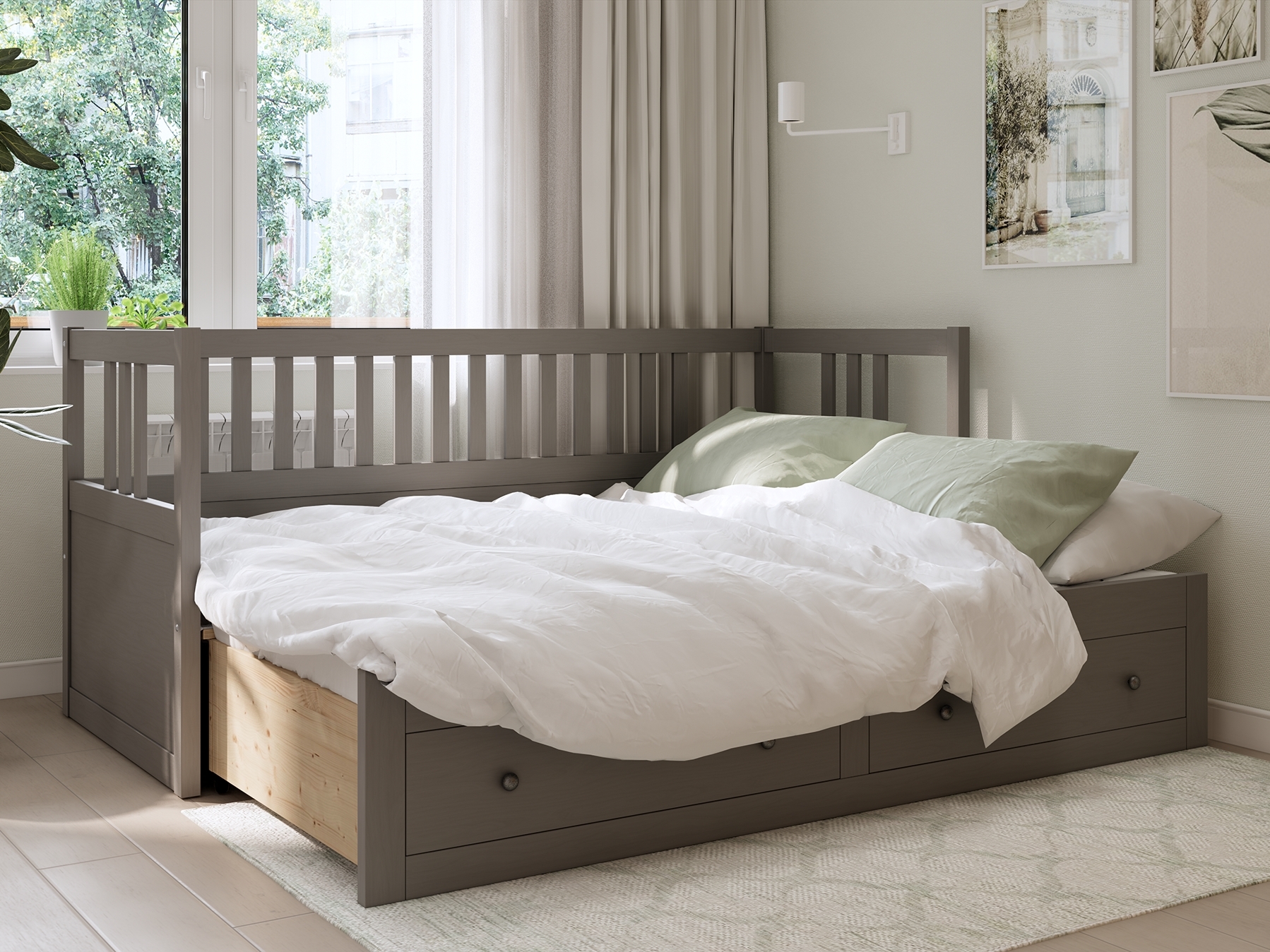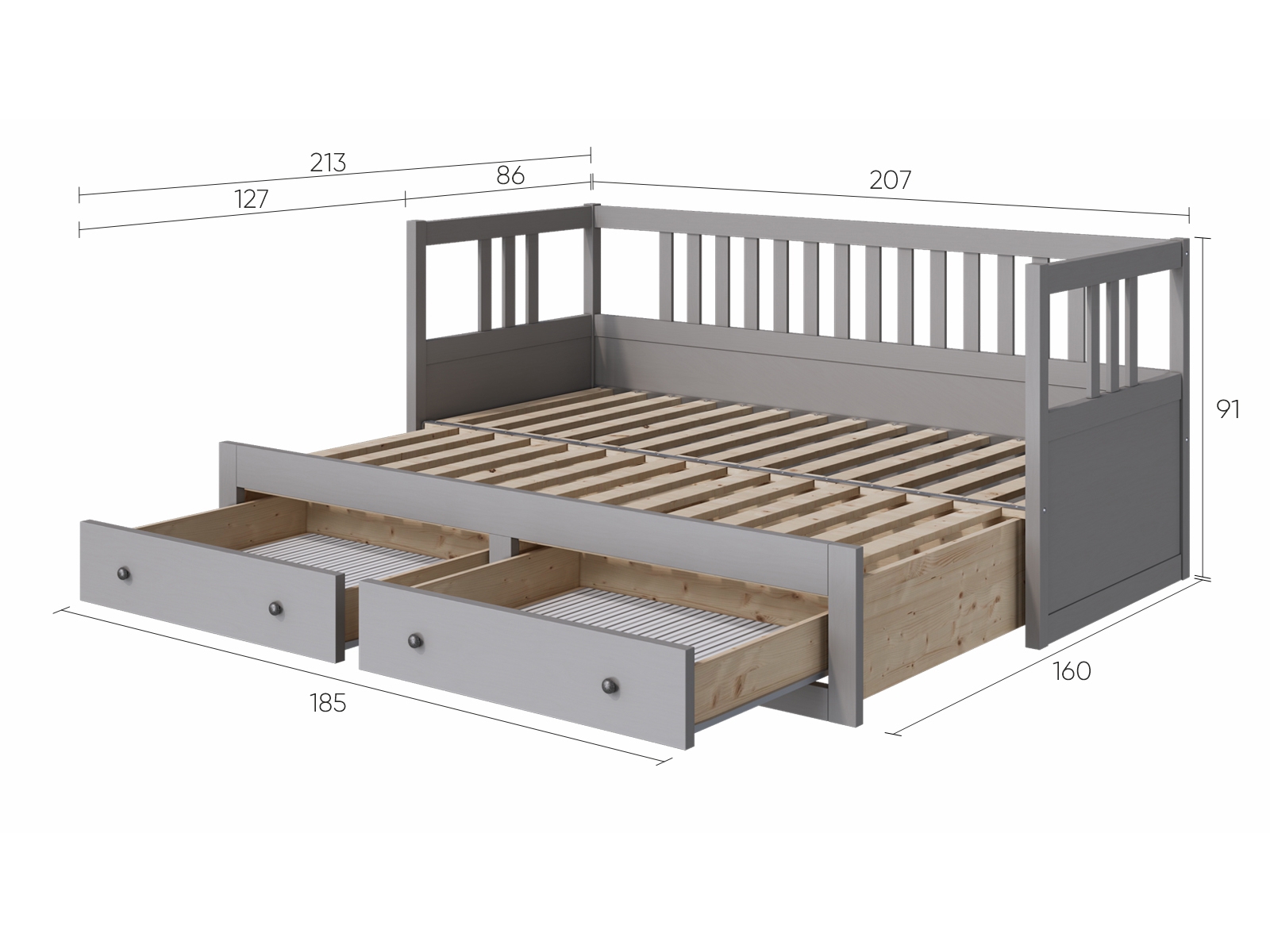 Деревянная Кровать - кушетка 80x200 с ящиками ХЕМНЭС (Россия) серый. Односпальная тахта трансформируется в двуспальную. Изготовлена из массива сосны. Поставляется в разобранном виде. Реечное основание в комплекте. Размер спального места 80х200 см, в разобранном виде 160х200 см. Внутренние размеры ящиков (ШxГxВ) - 53,5x70x20,5 см.