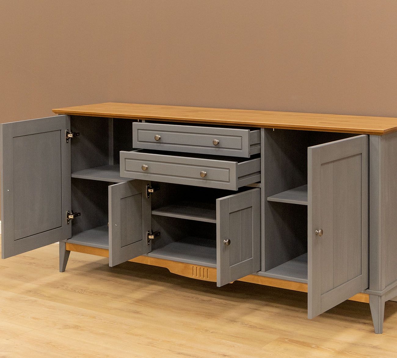 Четыре распашных дверцы на петлях с доводчиками, 2 ящика на шариковых направляющих частичного выдвижения без доводчиков.