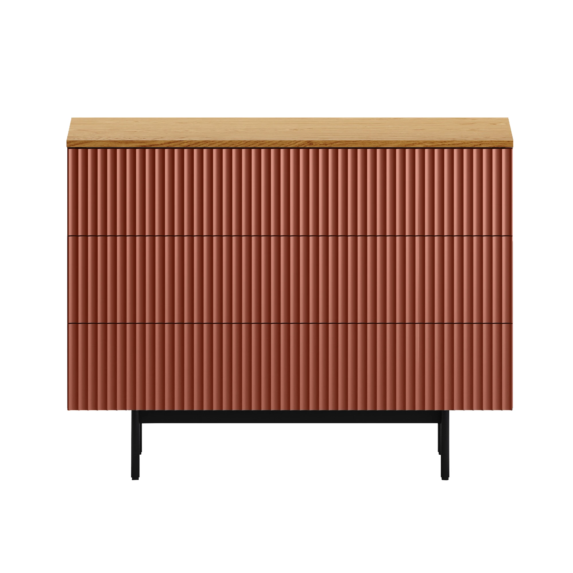 Коллекция Mikko — комплексная система хранения, разработанная для комфортного и актуального интерьера. Вы можете комбинировать различные предметы коллекции или использовать их отдельно. Лаконичный и выразительный внешний вид шкафов, тумб, сервантов, комодов стильно дружит с разными интерьерными решениями. Идея дизайна — баланс индустриального характера и органичных элементов. Мебель сочетает в себе прочное металлическое основание, крышку с дубовым шпоном и рельефный фасад с фрезеровкой. Дверцы и ящики открываются легким нажатием. Отсутствие фурнитуры придает моделям аккуратность и ритмичность. Используйте их для хранения книг, техники в гостиной, одежды и текстиля в спальне, важных мелочей в прихожей, документов и канцелярии в рабочей зоне, декоративных вещей в творческой локации. Можете выбрать цвет крышки: светлый или темный. С мебелью Mikko вы грамотно спрячете лишнее и эстетично экспонируете нужное. Комод Mikko c 3-мя ящиками ящиками на скрытых направляющих. Дно ящиков из ЛДСтП 16мм. Фасад и боковые стенки коллекции Mikko с фрезеровкой выполнены из МДФ толщиной 18 мм. в четырех вариантах декоров: Софт Сантьяго, Шарли Терракота, Шарли Грин, Графит. Крышка из МДФ толщиной 16 мм., облицованной строганным шпоном дуба. Остальные детали корпусов выполнены из плиты ламинированной толщиной 16 мм., декор белый гладкий. Лицевая фурнитура отсутствует, открывание фасадов по принципу нажал - открыл. Основания изделий металлические черного цвета с регулируемыми пластиковыми подпятниками.