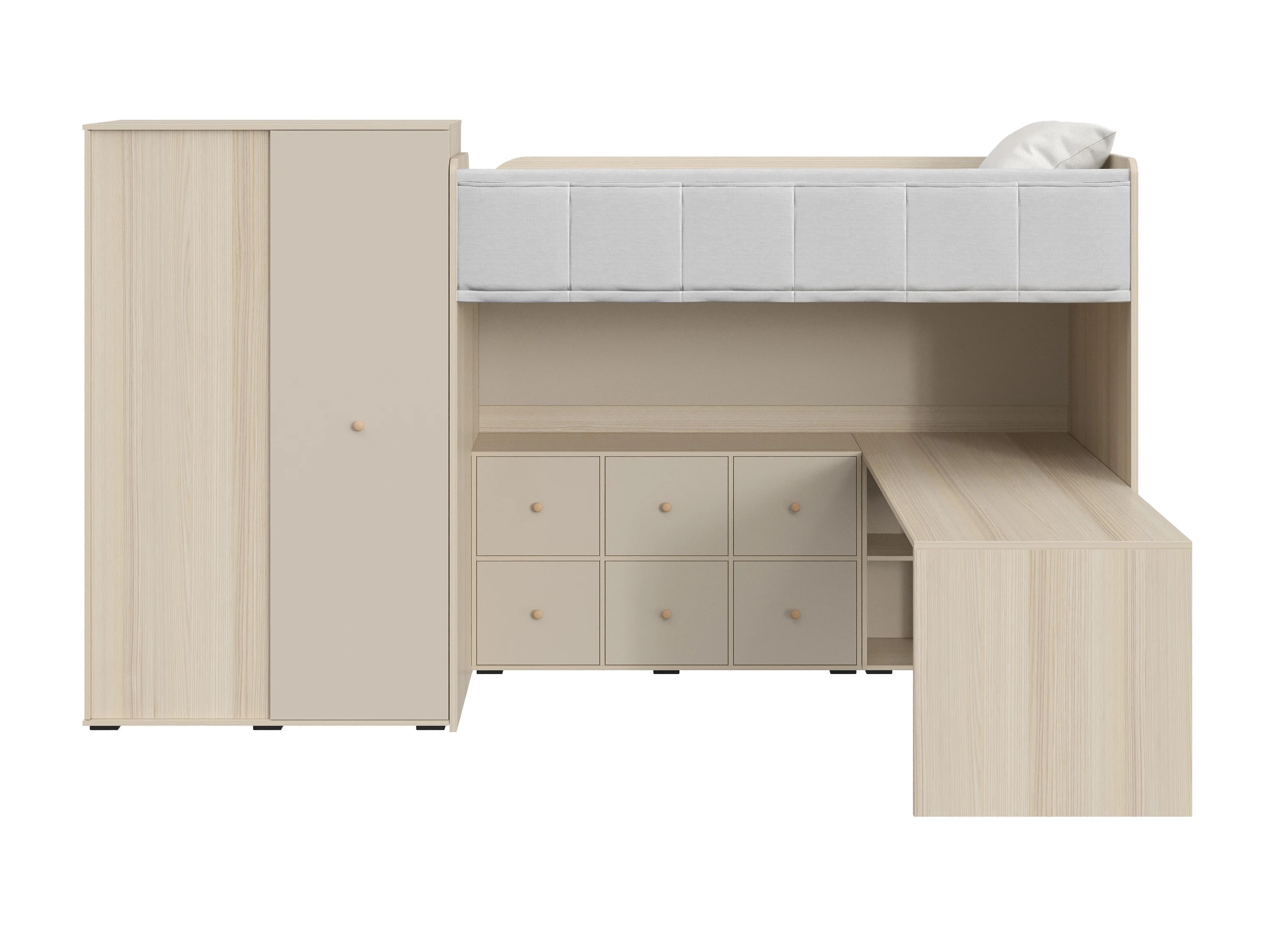 Play — коллекция модульной мебели для детской в спокойных оттенках светлого дерева с локальным добавлением ярких элементов. Естественные формы и цвета подружатся с любой стилевой темой. Подойдет как для дошкольников, так и для подростков. Изделия отвечают главным критериям детской мебели: безопасны, устойчивы, надёжны и эстетичны. Соблюдены экологические показатели, использована ЛДСП класса эмиссии Е1 и Е0,5 — для детской мебели с герметично закрытыми кромками. Из большого количества модулей вы можете спроектировать индивидуальное решение, исходя из потребностей и площади помещения. Для игровой локации, учебного места, спальной зоны, гардероба, хранения игрушек, техники и предметов для творчества — используйте модульные шкафы, стеллажи, тумбы, кровати-чердаки, столы, стеллажи-лестницы. Сквозные стеллажи идеальны в качестве перегородок в детской. Они пропускают свет, не перегружают площадь, позволяют использовать разные декоративные приёмы. Двухярусные кровати и «чердаки» удобно использовать в компактной локации. Шкафы напольные, навесные, тумбы, лаконичные столы — мебель Play поддержит атмосферу порядка и идеальный настрой на учёбу, творчество, поможет развить самостоятельность и аккуратность. Белые фасады отражают свет, освежают интерьер. С коллекцией Play вы легко создадите организованное и креативное пространство, в котором у каждой вещи есть своё место, и где ребенку комфортно учиться, играть, отдыхать, творить. Многофункциональная композиция для детской и молодежной. Ручки в стоимость изделия не включены, приобретаются отдельно.