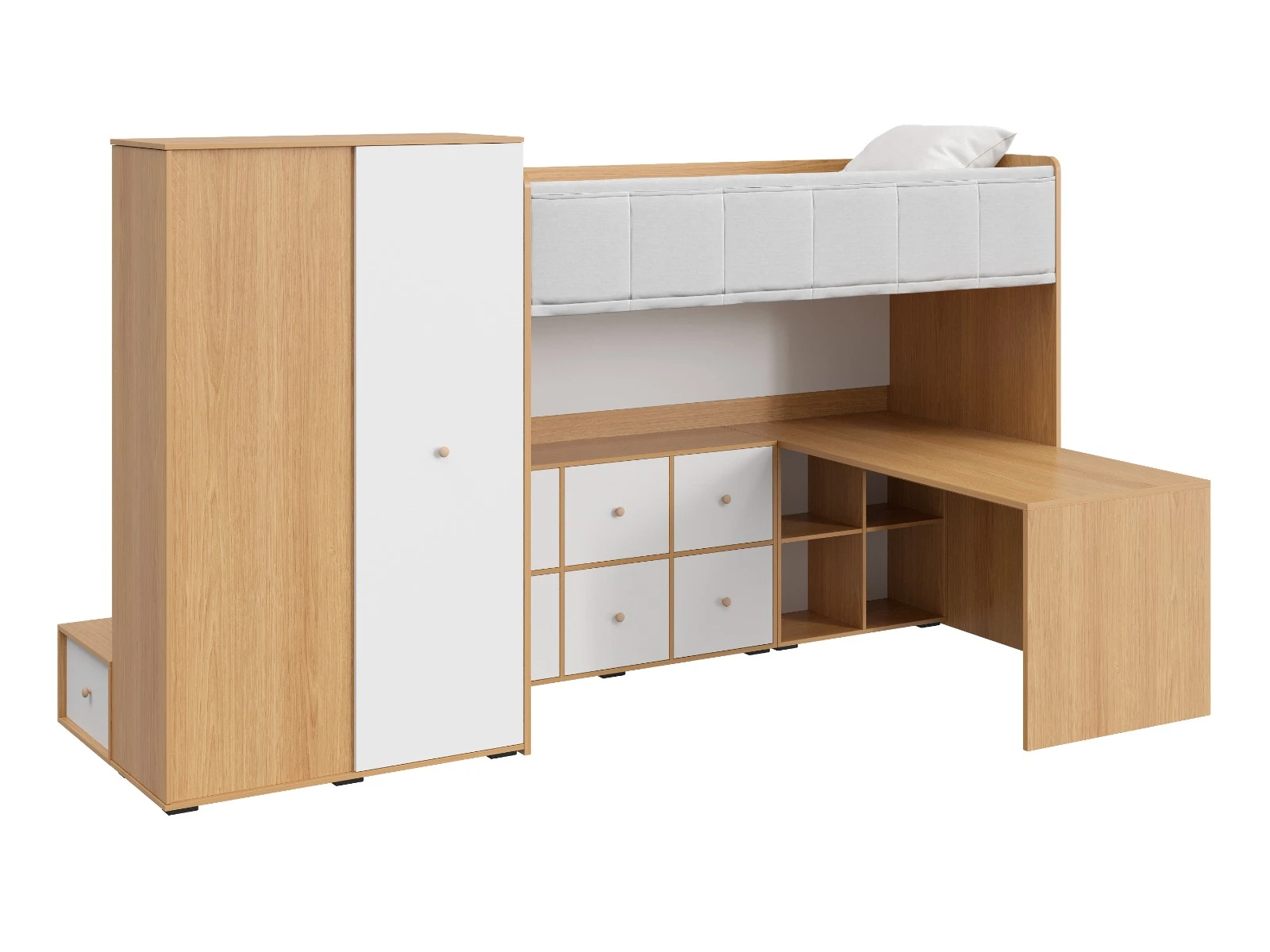 Play — коллекция модульной мебели для детской в спокойных оттенках светлого дерева с локальным добавлением ярких элементов. Естественные формы и цвета подружатся с любой стилевой темой. Подойдет как для дошкольников, так и для подростков. Изделия отвечают главным критериям детской мебели: безопасны, устойчивы, надёжны и эстетичны. Соблюдены экологические показатели, использована ЛДСП класса эмиссии Е1 и Е0,5 — для детской мебели с герметично закрытыми кромками. Из большого количества модулей вы можете спроектировать индивидуальное решение, исходя из потребностей и площади помещения. Для игровой локации, учебного места, спальной зоны, гардероба, хранения игрушек, техники и предметов для творчества — используйте модульные шкафы, стеллажи, тумбы, кровати-чердаки, столы, стеллажи-лестницы. Сквозные стеллажи идеальны в качестве перегородок в детской. Они пропускают свет, не перегружают площадь, позволяют использовать разные декоративные приёмы. Двухярусные кровати и «чердаки» удобно использовать в компактной локации. Шкафы напольные, навесные, тумбы, лаконичные столы — мебель Play поддержит атмосферу порядка и идеальный настрой на учёбу, творчество, поможет развить самостоятельность и аккуратность. Белые фасады отражают свет, освежают интерьер. С коллекцией Play вы легко создадите организованное и креативное пространство, в котором у каждой вещи есть своё место, и где ребенку комфортно учиться, играть, отдыхать, творить. Многофункциональная композиция для детской и молодежной. Ручки в стоимость изделия не включены, приобретаются отдельно.