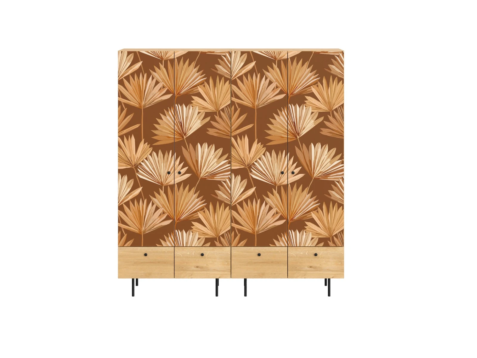Корпусная мебель, с которой можно составить множество решений для гостиной, детской, кухни, спальни, прихожей, рабочей зоны. Комоды, шкафы, тумбы, столы, витрины, полки, серванты характеризуются универсальностью, многозадачностью, надёжными устойчивыми конструкциями. Имеют выразительный внешний вид, вдохновленный направлением ретро. Смотрятся легко и воздушно за счет деревянных ножек, минимального количества декоративных элементов, спокойных природных оттенков. Их можно использовать в качестве систем хранения, элементов для зонирования, фокусных точек. В дизайне ярко выражена доминанта прямых форм, графичности, лаконичных линий и элегантного исполнения. Что даёт пространству ощущение размеренности, сбалансированности, упорядоченности. Подходят интерьерам как с нейтральной базой, так и локациям с интенсивными цветовыми блоками. Индивидуальности добавят модели с оригинальными паттернами на фасадах. Предметы коллекции Frida гармонично впишутся в эклектичные и стилизованные интерьеры. Ручки входят в стоимость изделия. Высота опор 160 мм. Изображение, нанесенное на фасады, устойчиво к выцветанию, истиранию и влаге. Однако длительное воздействие воды, различных растворителей, спиртосодержащих жидкостей и высоких температур, увеличивают риск повреждения целостности покрытия. Поэтому при использовании необходимо соблюдать ряд правил: 1. Протирайте поверхность с рисунком влажной (но не мокрой) тканью. 2. Используйте мягкие ткани, например, салфетки для стекла или зеркал. 3. Не используйте для обработки поверхности с нанесенным на нее рисунком чистящие порошки и средства, в состав которых входят ацетон, растворитель или спирт. 4. Не используйте металлические губки и щетки с жесткой щетиной. 5. Избегайте ударов, падения, царапания, трения изделий с фотопечатью.
