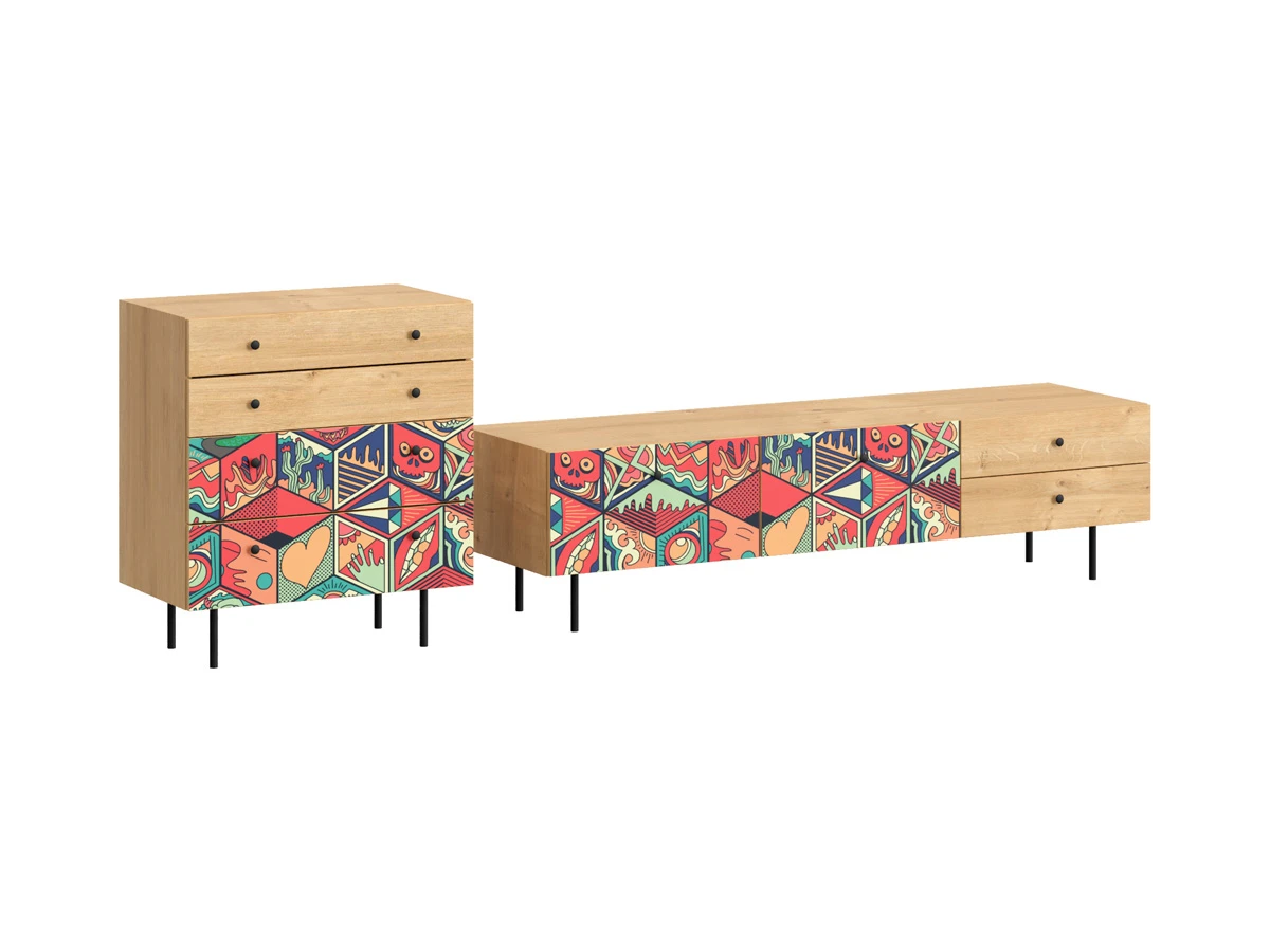 Корпусная мебель, с которой можно составить множество решений для гостиной, детской, кухни, спальни, прихожей, рабочей зоны. Комоды, шкафы, тумбы, столы, витрины, полки, серванты характеризуются универсальностью, многозадачностью, надёжными устойчивыми конструкциями. Имеют выразительный внешний вид, вдохновленный направлением ретро. Смотрятся легко и воздушно за счет деревянных ножек, минимального количества декоративных элементов, спокойных природных оттенков. Их можно использовать в качестве систем хранения, элементов для зонирования, фокусных точек. В дизайне ярко выражена доминанта прямых форм, графичности, лаконичных линий и элегантного исполнения. Что даёт пространству ощущение размеренности, сбалансированности, упорядоченности. Подходят интерьерам как с нейтральной базой, так и локациям с интенсивными цветовыми блоками. Индивидуальности добавят модели с оригинальными паттернами на фасадах. Предметы коллекции Frida гармонично впишутся в эклектичные и стилизованные интерьеры. Ручки входят в стоимость изделия. Высота опор 160 мм. Изображение, нанесенное на фасады, устойчиво к выцветанию, истиранию и влаге. Однако длительное воздействие воды, различных растворителей, спиртосодержащих жидкостей и высоких температур, увеличивают риск повреждения целостности покрытия. Поэтому при использовании необходимо соблюдать ряд правил: 1. Протирайте поверхность с рисунком влажной (но не мокрой) тканью. 2. Используйте мягкие ткани, например, салфетки для стекла или зеркал. 3. Не используйте для обработки поверхности с нанесенным на нее рисунком чистящие порошки и средства, в состав которых входят ацетон, растворитель или спирт. 4. Не используйте металлические губки и щетки с жесткой щетиной. 5. Избегайте ударов, падения, царапания, трения изделий с фотопечатью.