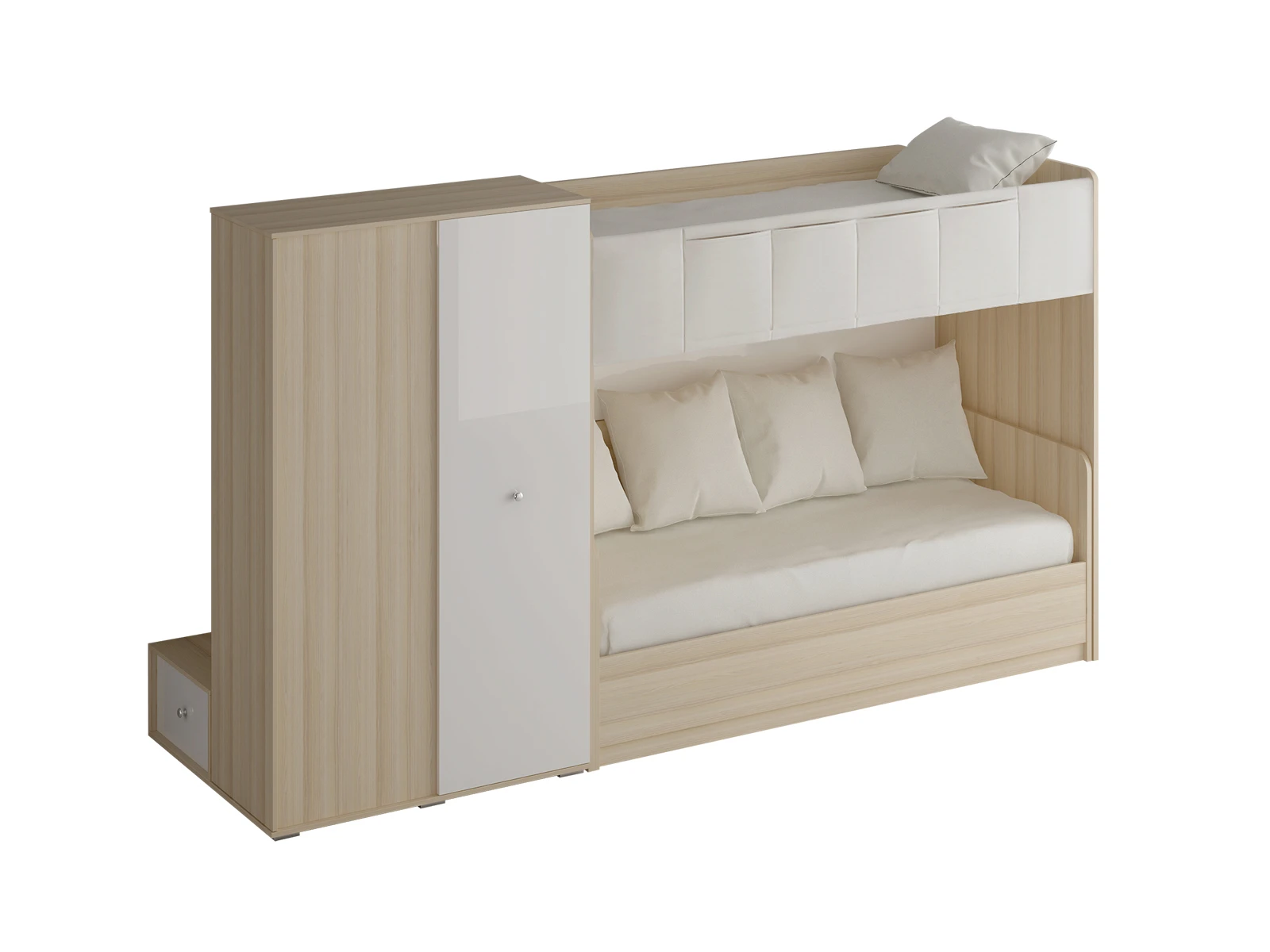 Play — коллекция модульной мебели для детской в спокойных оттенках светлого дерева с локальным добавлением ярких элементов. Естественные формы и цвета подружатся с любой стилевой темой. Подойдет как для дошкольников, так и для подростков. Изделия отвечают главным критериям детской мебели: безопасны, устойчивы, надёжны и эстетичны. Соблюдены экологические показатели, использована ЛДСП класса эмиссии Е1 и Е0,5 — для детской мебели с герметично закрытыми кромками. Из большого количества модулей вы можете спроектировать индивидуальное решение, исходя из потребностей и площади помещения. Для игровой локации, учебного места, спальной зоны, гардероба, хранения игрушек, техники и предметов для творчества — используйте модульные шкафы, стеллажи, тумбы, кровати-чердаки, столы, стеллажи-лестницы. Сквозные стеллажи идеальны в качестве перегородок в детской. Они пропускают свет, не перегружают площадь, позволяют использовать разные декоративные приёмы. Двухярусные кровати и «чердаки» удобно использовать в компактной локации. Шкафы напольные, навесные, тумбы, лаконичные столы — мебель Play поддержит атмосферу порядка и идеальный настрой на учёбу, творчество, поможет развить самостоятельность и аккуратность. Белые фасады отражают свет, освежают интерьер. С коллекцией Play вы легко создадите организованное и креативное пространство, в котором у каждой вещи есть своё место, и где ребенку комфортно учиться, играть, отдыхать, творить. Многофункциональная композиция для детской и молодежной. Ручки в стоимость изделия не включены, приобретаются отдельно.