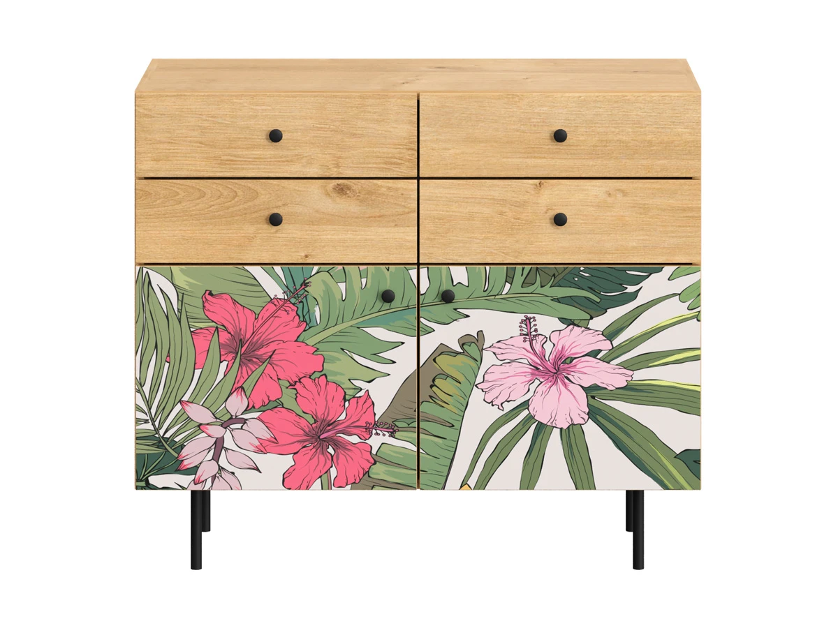 Корпусная мебель, с которой можно составить множество решений для гостиной, детской, кухни, спальни, прихожей, рабочей зоны. Комоды, шкафы, тумбы, столы, витрины, полки, серванты характеризуются универсальностью, многозадачностью, надёжными устойчивыми конструкциями. Имеют выразительный внешний вид, вдохновленный направлением ретро. Смотрятся легко и воздушно за счет деревянных ножек, минимального количества декоративных элементов, спокойных природных оттенков. Их можно использовать в качестве систем хранения, элементов для зонирования, фокусных точек. В дизайне ярко выражена доминанта прямых форм, графичности, лаконичных линий и элегантного исполнения. Что даёт пространству ощущение размеренности, сбалансированности, упорядоченности. Подходят интерьерам как с нейтральной базой, так и локациям с интенсивными цветовыми блоками. Индивидуальности добавят модели с оригинальными паттернами на фасадах. Предметы коллекции Frida гармонично впишутся в эклектичные и стилизованные интерьеры. Ручки входят в стоимость изделия. Высота опор 160 мм. Изображение, нанесенное на фасады, устойчиво к выцветанию, истиранию и влаге. Однако длительное воздействие воды, различных растворителей, спиртосодержащих жидкостей и высоких температур, увеличивают риск повреждения целостности покрытия. Поэтому при использовании необходимо соблюдать ряд правил: 1. Протирайте поверхность с рисунком влажной (но не мокрой) тканью. 2. Используйте мягкие ткани, например, салфетки для стекла или зеркал. 3. Не используйте для обработки поверхности с нанесенным на нее рисунком чистящие порошки и средства, в состав которых входят ацетон, растворитель или спирт. 4. Не используйте металлические губки и щетки с жесткой щетиной. 5. Избегайте ударов, падения, царапания, трения изделий с фотопечатью.