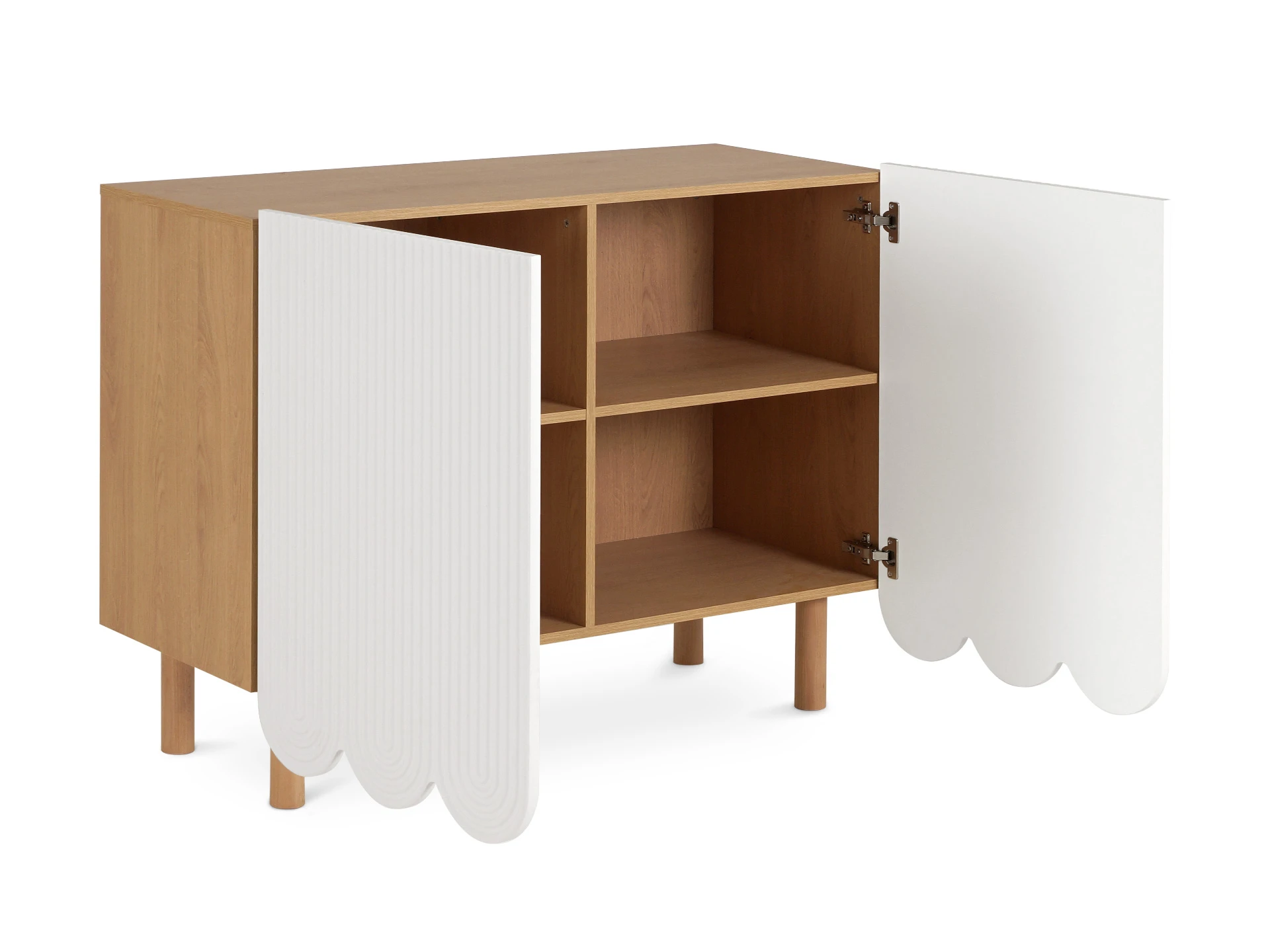 Mira — коллекция выразительных сервантов, особенностью которых являются фактурные фасады с волнообразной обработкой нижнего края. Дизайн привлекает внимание. Рифлёная поверхность распашных дверей придаёт динамики и разнообразия. Компактные круглые ножки из бука невысоко приподнимают над полом корпус серванта. Что обеспечивает лёгкость восприятия и воздушность модели. А также простоту уборки. За дверцами скрываются 4 отсека для хранения разных предметов от техники до косметики. Сервант Mira можно использовать в качестве ТВ-тумбы в гостиной, найдётся ему местечко и в спальне, рабочей или обеденной зоне. Можно дополнить органайзерами для хранения украшений, аксессуаров. Цвет фасадов может быть ярким, например, терракотовым, графитовым, или нейтральным: белым, бежевым. В любом варианте сервант Mira станет эффектным акцентом интерьера. Материал корпуса: ЛДСтП 16 мм. (все панели, включая заднюю стенку). Материал фасада: МДФ 19 мм., облицованная пленкой ПВХ. Опоры: массив бука. На опоры установлены фетровые подпятники. Отделка опор – масло защитное для дерева. Петли дверей – с плавным закрыванием. Внутренние полки – съемные. Сервант рекомендуется крепить к стене (крепежи в комплекте).