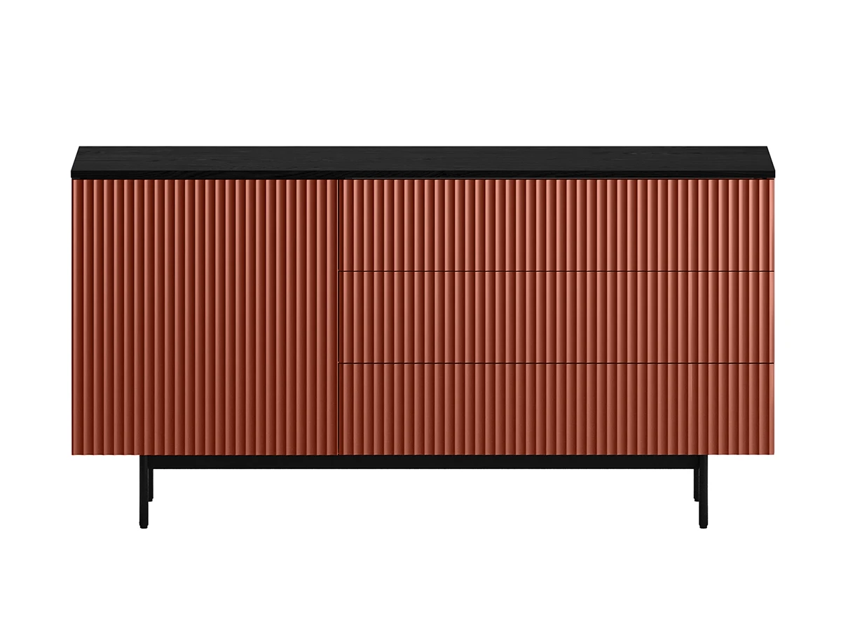 Коллекция Mikko — комплексная система хранения, разработанная для комфортного и актуального интерьера. Вы можете комбинировать различные предметы коллекции или использовать их отдельно. Лаконичный и выразительный внешний вид шкафов, тумб, сервантов, комодов стильно дружит с разными интерьерными решениями. Идея дизайна — баланс индустриального характера и органичных элементов. Мебель сочетает в себе прочное металлическое основание, крышку с дубовым шпоном и рельефный фасад с фрезеровкой. Дверцы и ящики открываются легким нажатием. Отсутствие фурнитуры придает моделям аккуратность и ритмичность. Используйте их для хранения книг, техники в гостиной, одежды и текстиля в спальне, важных мелочей в прихожей, документов и канцелярии в рабочей зоне, декоративных вещей в творческой локации. Можете выбрать цвет крышки: светлый или темный. С мебелью Mikko вы грамотно спрячете лишнее и эстетично экспонируете нужное. Сервант Mikko разделен вертикальной перегородкой на два отделения, левое за распашной дверью, в правом три ящика на скрытых направляющих, дно ящиков из ЛДСтП 16мм. За дверью одна съёмная полка, перестановка полки по высоте не предусмотрена. Фасад и боковые стенки коллекции Mikko с фрезеровкой выполнены из МДФ толщиной 18 мм. в четырех вариантах декоров: Софт Сантьяго, Шарли Терракота, Шарли Грин, Графит. Крышка из МДФ толщиной 16 мм., облицованной строганным шпоном дуба. Остальные детали корпусов выполнены из плиты ламинированной толщиной 16 мм., декор белый гладкий. Лицевая фурнитура отсутствует, открывание фасадов по принципу нажал - открыл. Основания изделий металлические черного цвета с регулируемыми пластиковыми подпятниками.