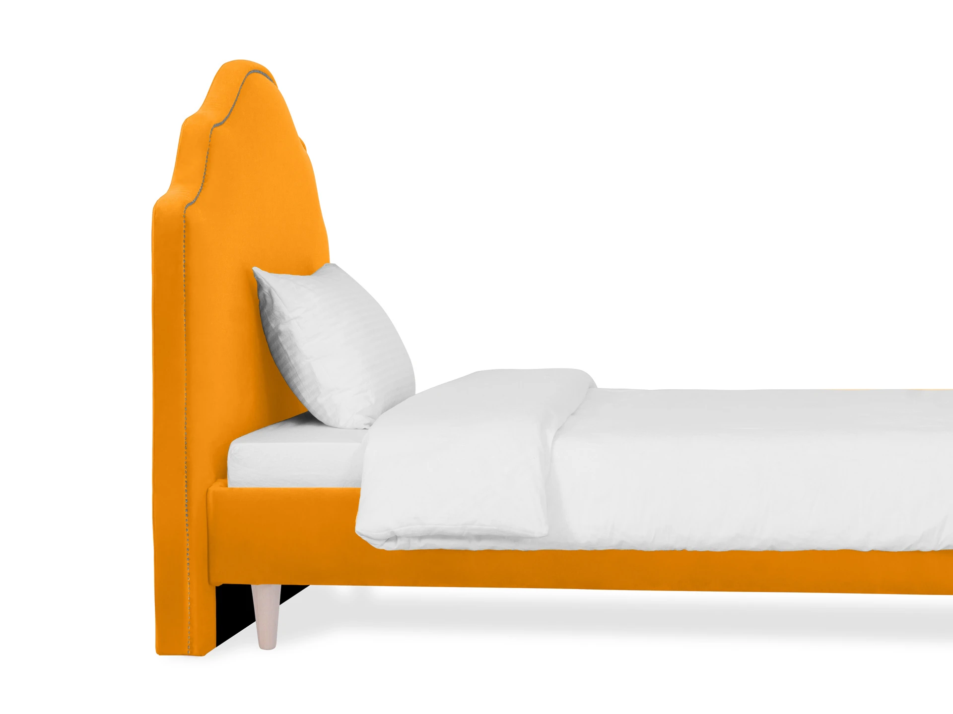 Кровать односпальная. Спинка кровати декорирована молдингом, установлена на пластмассовые опоры. Основание установлено на ножки из массива дерева и обрамлено мягкими царгами. Размер спального места: 1200х2000 мм.
