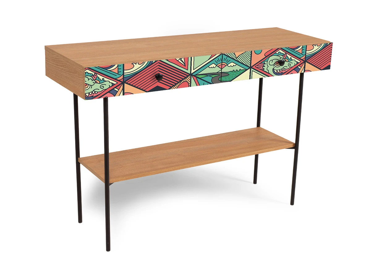 Корпусная мебель, с которой можно составить множество решений для гостиной, детской, кухни, спальни, прихожей, рабочей зоны. Комоды, шкафы, тумбы, столы, витрины, полки, серванты характеризуются универсальностью, многозадачностью, надёжными устойчивыми конструкциями. Имеют выразительный внешний вид, вдохновленный направлением ретро. Смотрятся легко и воздушно за счет деревянных ножек, минимального количества декоративных элементов, спокойных природных оттенков. Их можно использовать в качестве систем хранения, элементов для зонирования, фокусных точек. В дизайне ярко выражена доминанта прямых форм, графичности, лаконичных линий и элегантного исполнения. Что даёт пространству ощущение размеренности, сбалансированности, упорядоченности. Подходят интерьерам как с нейтральной базой, так и локациям с интенсивными цветовыми блоками. Индивидуальности добавят модели с оригинальными паттернами на фасадах. Предметы коллекции Frida гармонично впишутся в эклектичные и стилизованные интерьеры. Стол консольный установлен на высокое металлическое основание окрашенное черной эмалью из круглой трубы d 20 мм. и высотой 674 мм, с пластиковыми подпятниками. В столе два ящика на скрытых направляющих. В нижней части основания установлена полка. Соединительная фурнитура – Hettich. Материалы корпуса и фасада – ЛДСтП толщиной 16 мм.. Стол консольный рекомендуется крепить к стене для защиты от опрокидывания (крепежи входят в комплект). Высота опор 160 мм. Изображение, нанесенное на фасады, устойчиво к выцветанию, истиранию и влаге. Однако длительное воздействие воды, различных растворителей, спиртосодержащих жидкостей и высоких температур, увеличивают риск повреждения целостности покрытия. Поэтому при использовании необходимо соблюдать ряд правил: 1. Протирайте поверхность с рисунком влажной (но не мокрой) тканью. 2. Используйте мягкие ткани, например, салфетки для стекла или зеркал. 3. Не используйте для обработки поверхности с нанесенным на нее рисунком чистящие порошки и средства, в состав которых входят ацетон, растворитель или спирт. 4. Не используйте металлические губки и щетки с жесткой щетиной. 5. Избегайте ударов, падения, царапания, трения изделий с фотопечатью.