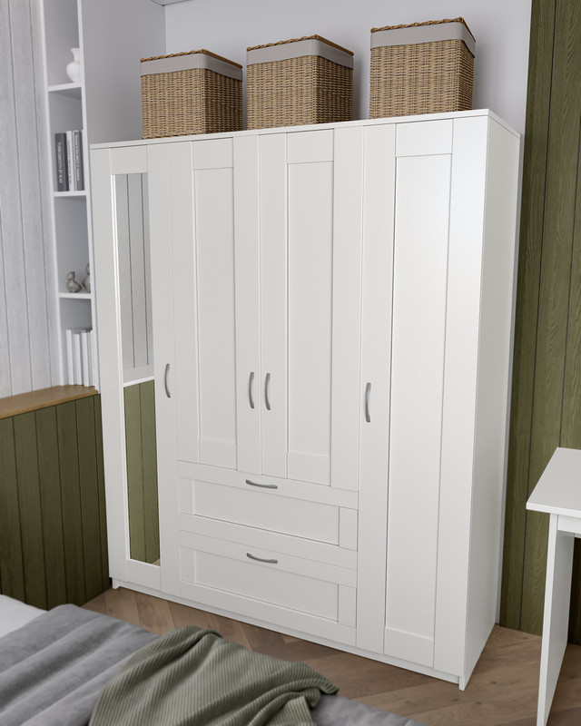 Шкаф СИРИУС комбинированный для одежды четырехдверный, с двумя выдвижными ящиками и одним зеркалом, 1561х502х1900, цвет Белый. Изготовлен из кашированного ДСП толщиной 16 мм. Крепится к стене. Гарантийный срок для жилых помещений 24 месяца, для общественных помещений - 18 месяцев.