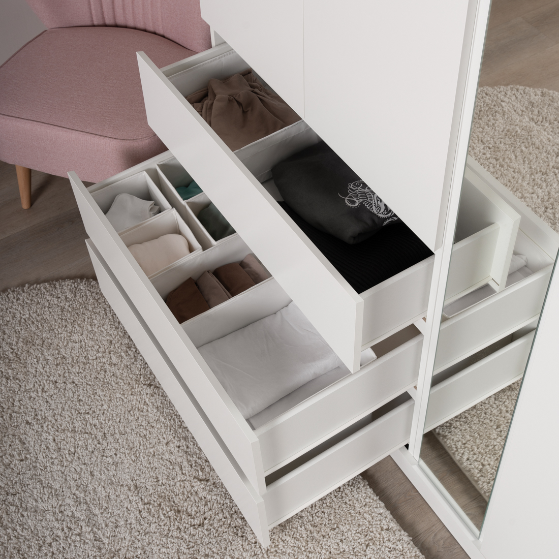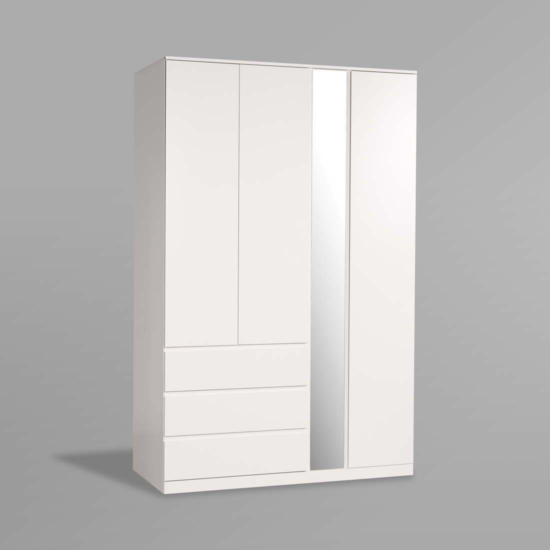 Шкаф Варма Стор 144: вместительный шкаф шириной 1440 мм из серии шкафов ВАРМА СТОР. Выполнен в классическом строгом белом дизайне с ручками скрытого типа. 3 распашных фасада, 3 выдвижных ящика и одна зеркальная секция, оснащен 2-мя гардеробными штангами.