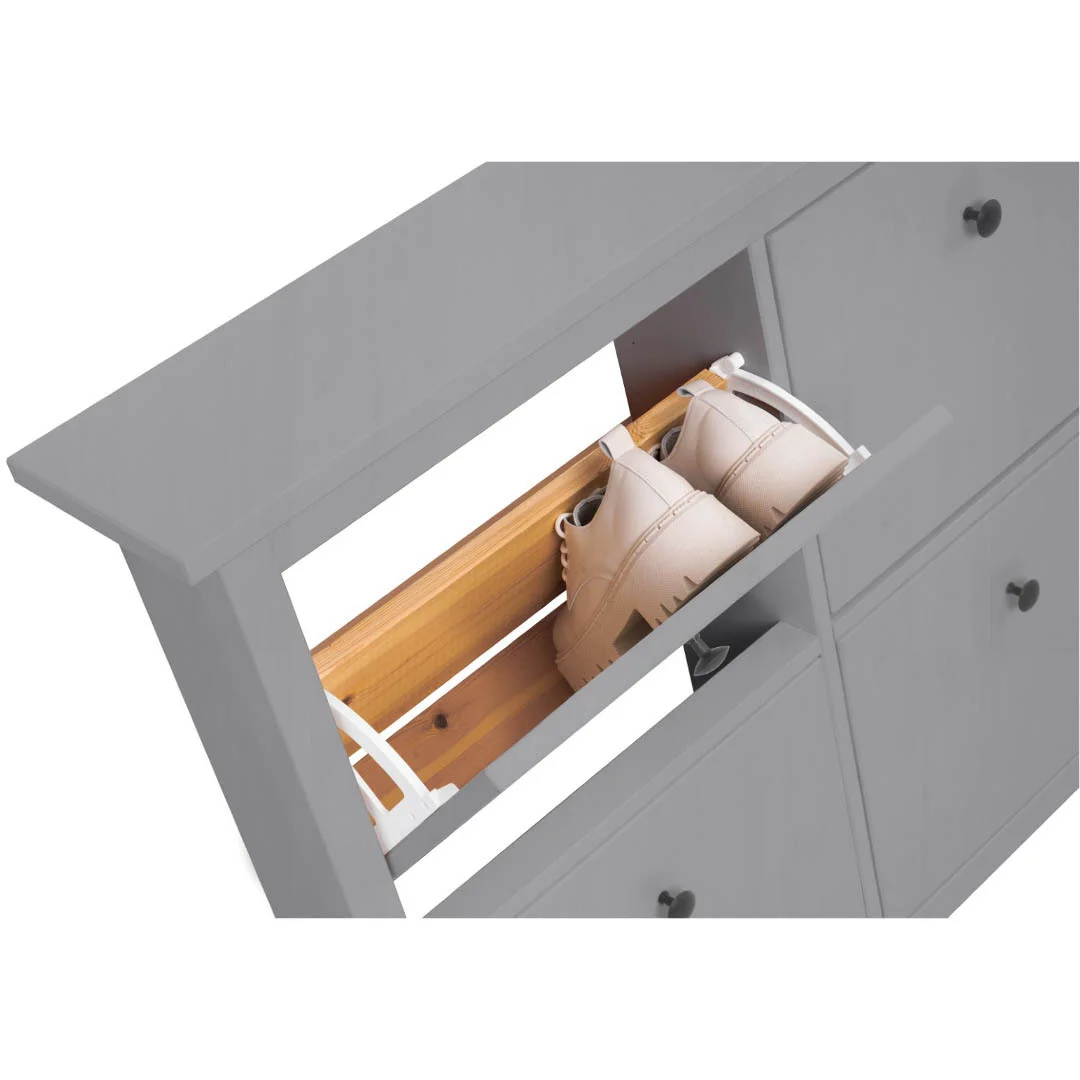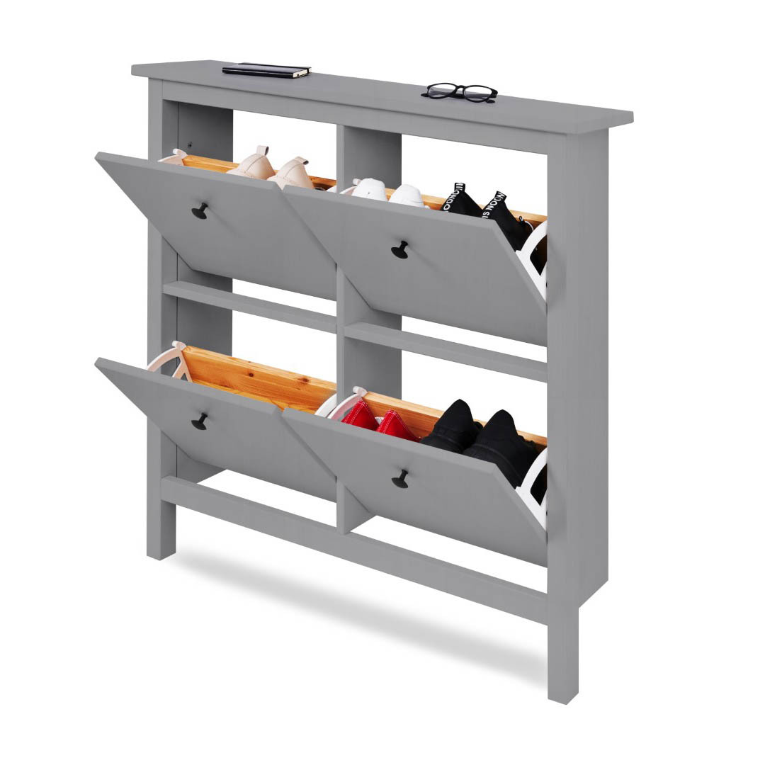 КЫМОР Тумба для обуви 106х101х22 серый. Четыре отделения с откидными панелями. Изготовлена из массива сосны. Поставляется в разобранном виде. Нижние отделения имеют дополнительную полку для размещения невысокой обуви.