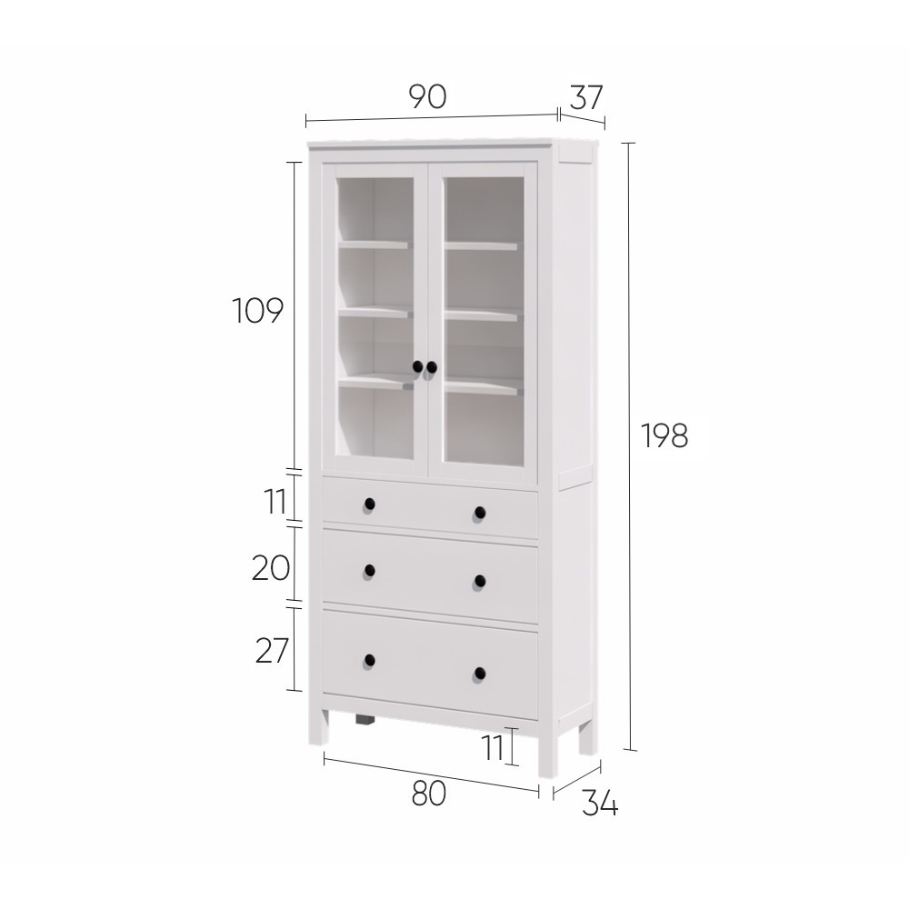 Деревянный Шкаф-витрина 3 ящика ХЕМНЭС (Россия) оригинал белый купить по доступной цене в Москве. Изготовлен из массива сосны. Дно ящиков и задняя стенка из оргалита. На полках можно разместить коллекцию книг, посуды, декор и памятные сувениры.