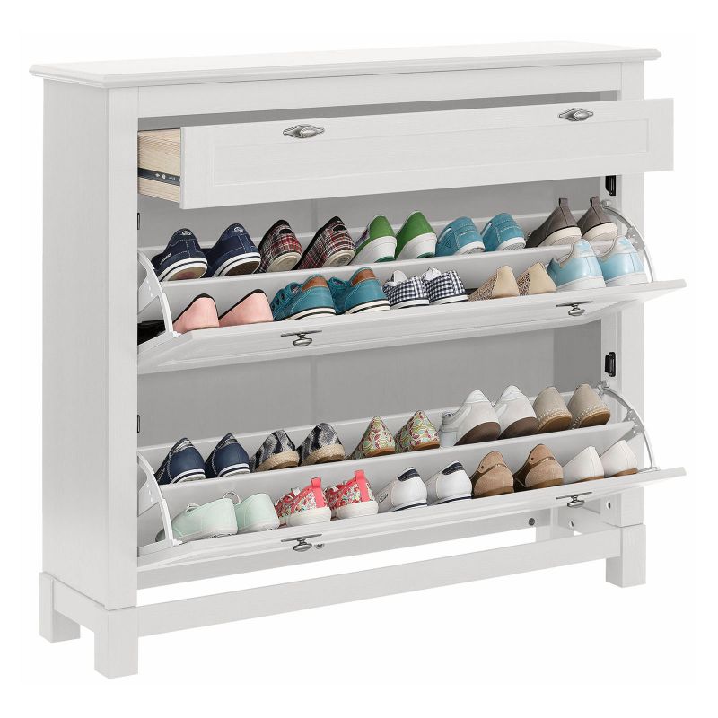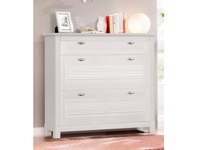 Двухсекционную тумбу в отделке белым воском из массива сосны с ящиком для хранения аксессуаров. Тумба имеет три отделения для размещения обуви для всей семьи.