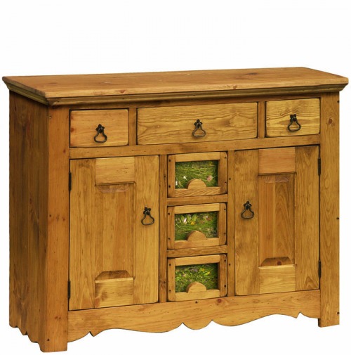 Тумба GRAINETIER 125 имеет 6 выдвижных ящиков. Из них 3 - со стеклом. В качестве декора используют зерна растений, лепестки цветов, сухоцветы, ракушки и т.п. Массив сосны, старение. Кованные ручки.